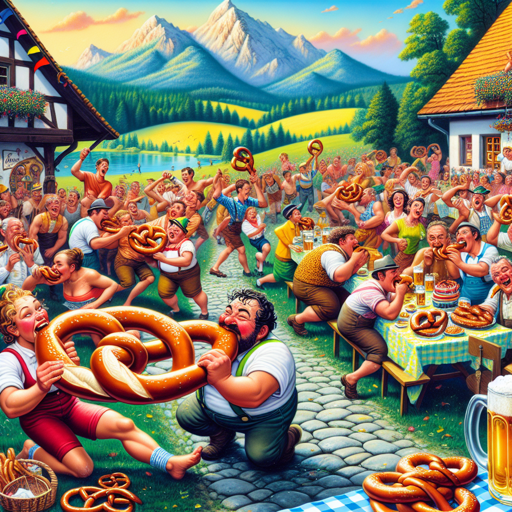Illustrate a vibrant scene set in the idyllic German countryside, featuring a lively crowd engaged in an eating contest during a birthday party, humorously exaggerated. Include characters of different genders and descents, some struggling to munch on gigantic pretzels and sausages while taking sips of beer, others engaged in joyful discussion. In the foreground, portray a welcoming path inviting more party attendees of various genders and descents to join the festivity, symbolizing the exercise of walking. The air should be filled with echoes of laughter and the sound of celebratory music.