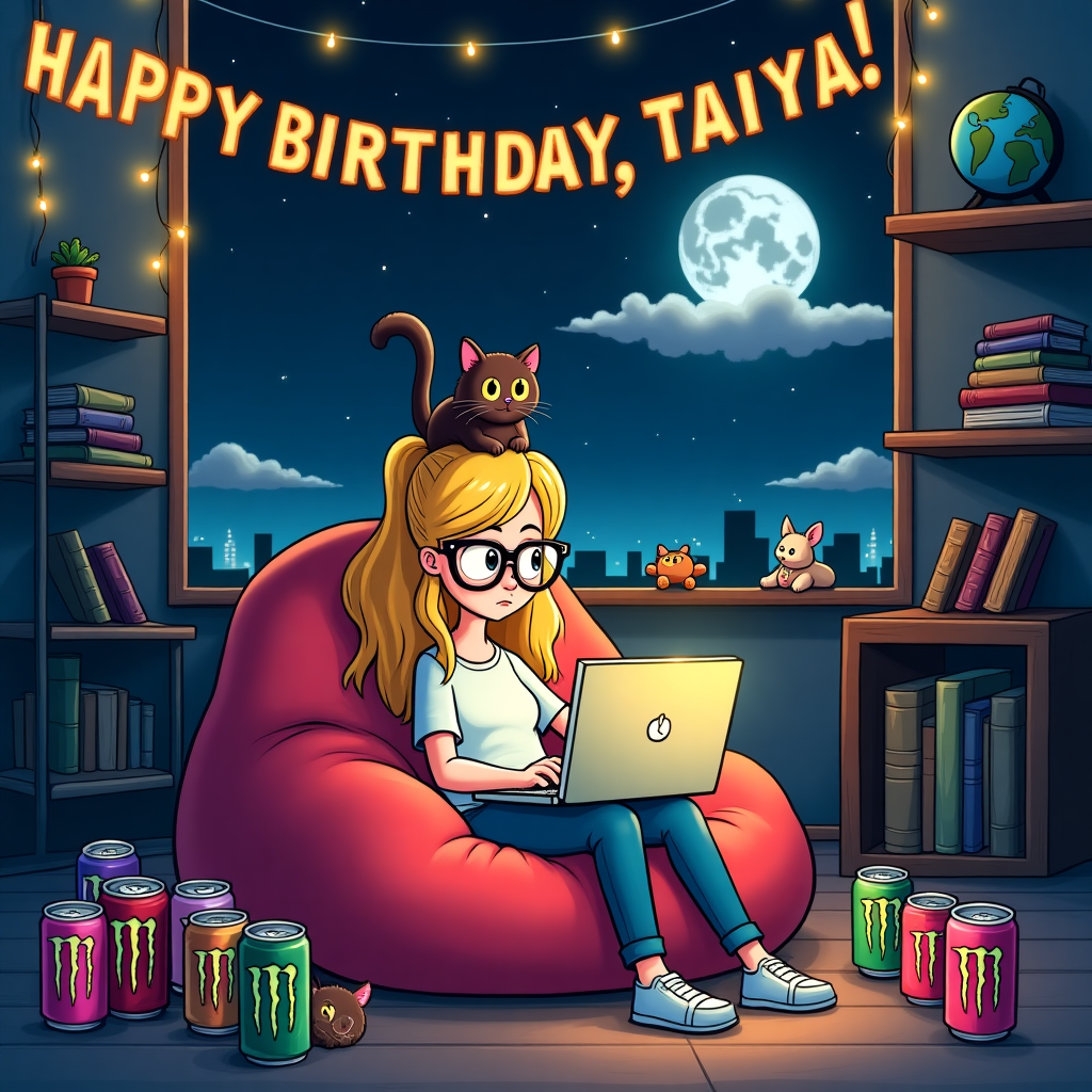Suspended above the scene is a whimsical "Happy Birthday, Taiya!" banner, strung across the ceiling with colorful letters that seem to dance with the twinkling lights. In the background, a window reveals a dark, star-studded sky where a cloud miraculously takes the shape of Taiya’s name, subtly highlighted by the moon’s silvery glow. This hidden celestial Easter egg adds an extra layer of personalized charm to the card. The overall setting tells the story of Taiya’s introverted birthday celebration, where her closest companions are a trusty laptop, endless energy drinks, and a purring feline friend, all wrapped up in a cozy cocoon of digital adventures and imaginative dreams.