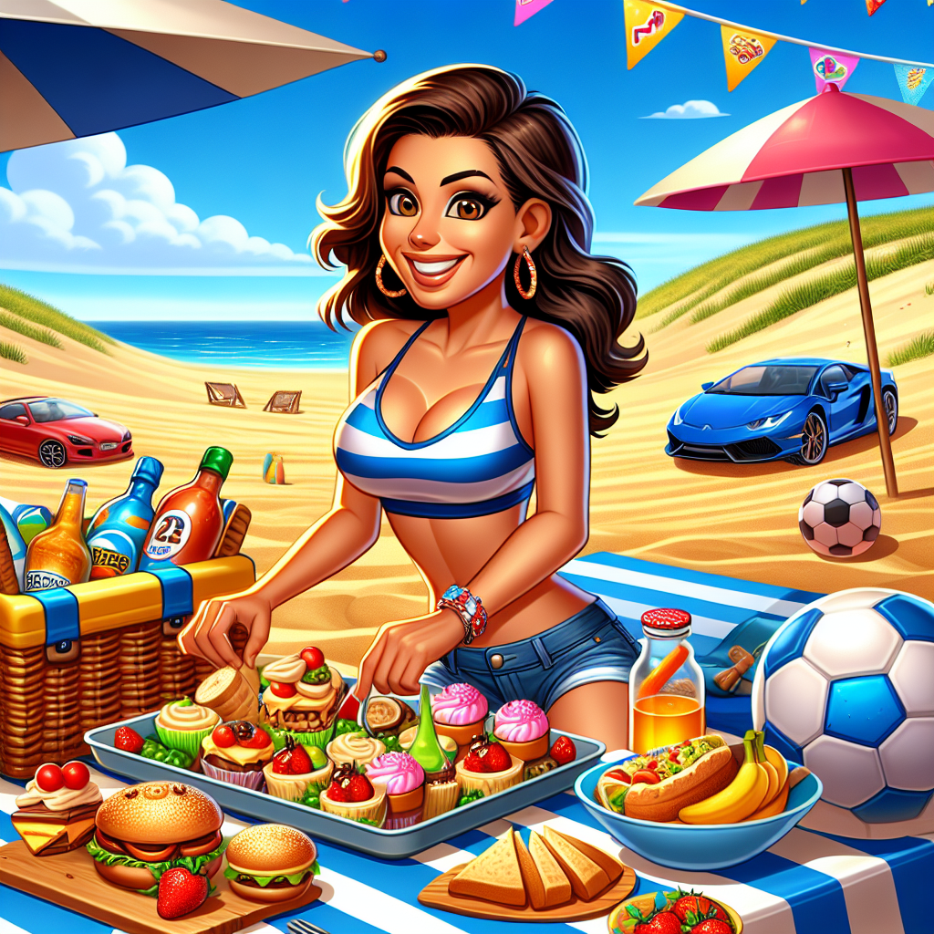 Depict a lively and zesty cartoon birthday scene on a lively beach under the bright glow of a summer day. The scene's focal point should be a cartoon woman of Hispanic descent with brunette hair and a heartwarming grin, outfitted in casual beach apparel. She is actively arranging a picnic that features a variety of healthful, gym-inspired snacks. On the sandy dunes in the background, spot vividly colored sports cars and beach balls with generic soccer jerseys. The surroundings exude relaxation and celebration, with elements from each theme smoothly blended to cultivate a festive summer holiday atmosphere.