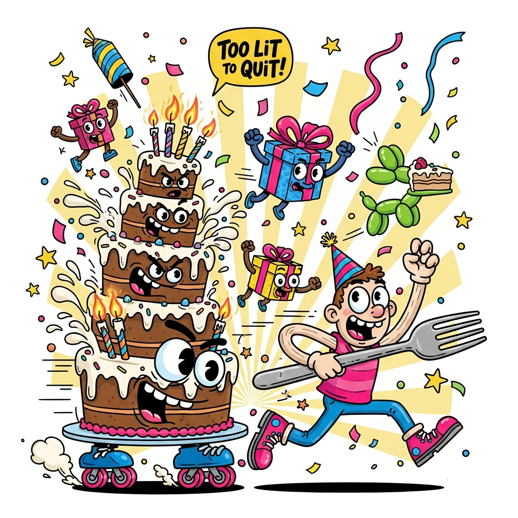 Vertical, funny cartoon birthday scene with exaggerated proportions and thick black outlines: a towering three-tier cake on roller skates zooms across the frame, candles blazing like tiny rockets, frosting splashing and rainbow sprinkles flying. The cake has big googly eyes and a mischievous grin. A wide-eyed birthday hero with noodle arms, oversized shoes, and a pointy party hat sprints after it wielding an absurdly giant fork. Around them, a balloon dog floats by clutching a slice, gift boxes with faces cheer, and confetti, streamers, and starbursts burst in every direction. Bright saturated palette (hot pink, electric blue, sunny yellow, lime green), squash-and-stretch poses, energetic motion lines, playful cel shading, glossy highlights, and a clean bold graphic burst backdrop with warm candle glow rim-lighting. Include one small caption in chunky hand-lettered bubble text with a thick outline near the top: “Too lit to quit.”