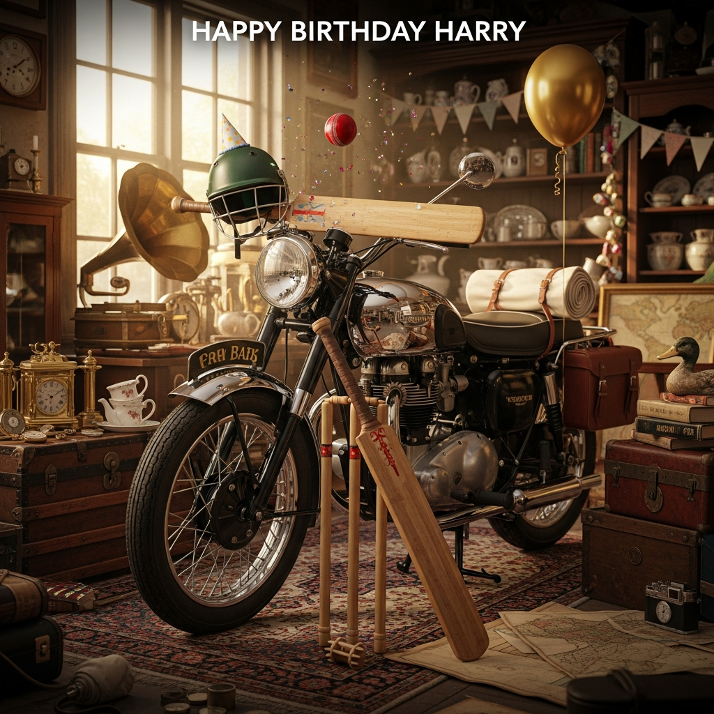 Ultra-high-definition 4K UHD photorealistic photograph, portrait orientation, with accurate lighting, lifelike textures, and a rich, cinematic depth of field. Scene: inside a cozy, cluttered British antique shop at golden hour, sunbeams slicing through dusty windows, motes glittering. Center stage: a gleaming vintage British motorcycle (chrome glinting, oxblood leather saddle) parked three-quarters to camera on a worn Persian rug. The bike is humorously kitted for cricket: a willow bat strapped across the handlebars with aged leather ties, crisp white pads attached like panniers, a deep-green cricket helmet perched on the mirror, and three wicket stumps made from antique walking canes leaning by the front wheel with a bail precariously balanced. A bright red cricket ball is frozen mid-air as if just bowled toward the bat, tiny specks of dust and a few bits of confetti suspended around it. Surrounding antiques: brass clocks and pocket watches, gramophone horn, stacked china teacups, wooden trunks, tarnished picture frames, and old maps—patina, wood grain, and metal textures rendered vividly. Subtle birthday touches: a single gold balloon tied to the rear rack, bunting draped lightly along a shelf, and a small party hat sitting on the helmet. Comedic Easter egg: a porcelain duck figurine softly out of focus on a shelf in the background. Camera style: full-frame 50mm prime, f/2, 1/1000s, ISO 200—shallow depth of field, creamy bokeh, crisp micro-contrast on chrome and leather; natural warm window light, realistic soft shadows, clean reflections, no over-saturation. Color palette: warm ambers, mahogany wood, aged brass, pops of cricket white and red. At the bottom of the image, add a small cheeky caption: "Zero ducks, all torque."