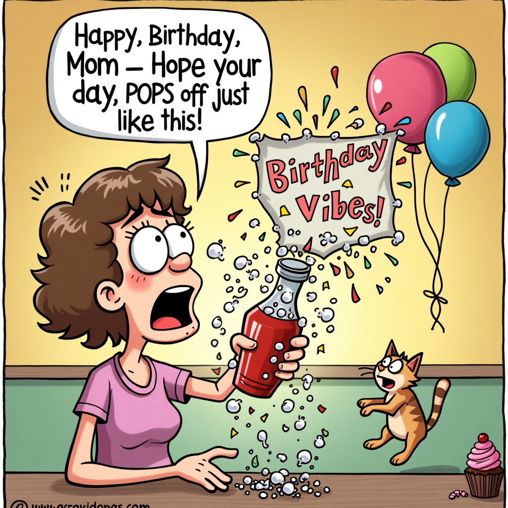 At the top of the cartoon image: *“Happy Birthday, Mom — Hope your day POPS off just like this!”*