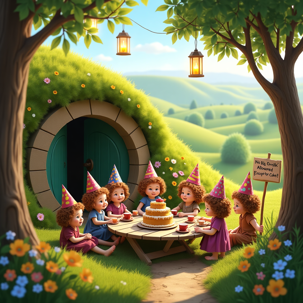 Realistic photograph-style image: A cozy Hobbit-style birthday picnic scene set in the rolling green hills of the Shire. A tiny round Hobbit hole is nestled in a hillside with colorful flowers blooming around the round green door. In front, a rustic wooden table is laden with mini teacups, pastries, scones, and a tiny birthday cake shaped like a mushroom house. A group of adorable, realistically rendered Hobbit children with curly hair and bare furry feet gather around in joyful celebration, wearing little paper party hats. Sunlight dapples through overhanging branches, and a few lanterns hang from a nearby tree, twinkling faintly. A sign nearby reads "No Big Folk Allowed (Except for Cake!)" in whimsical handwriting.