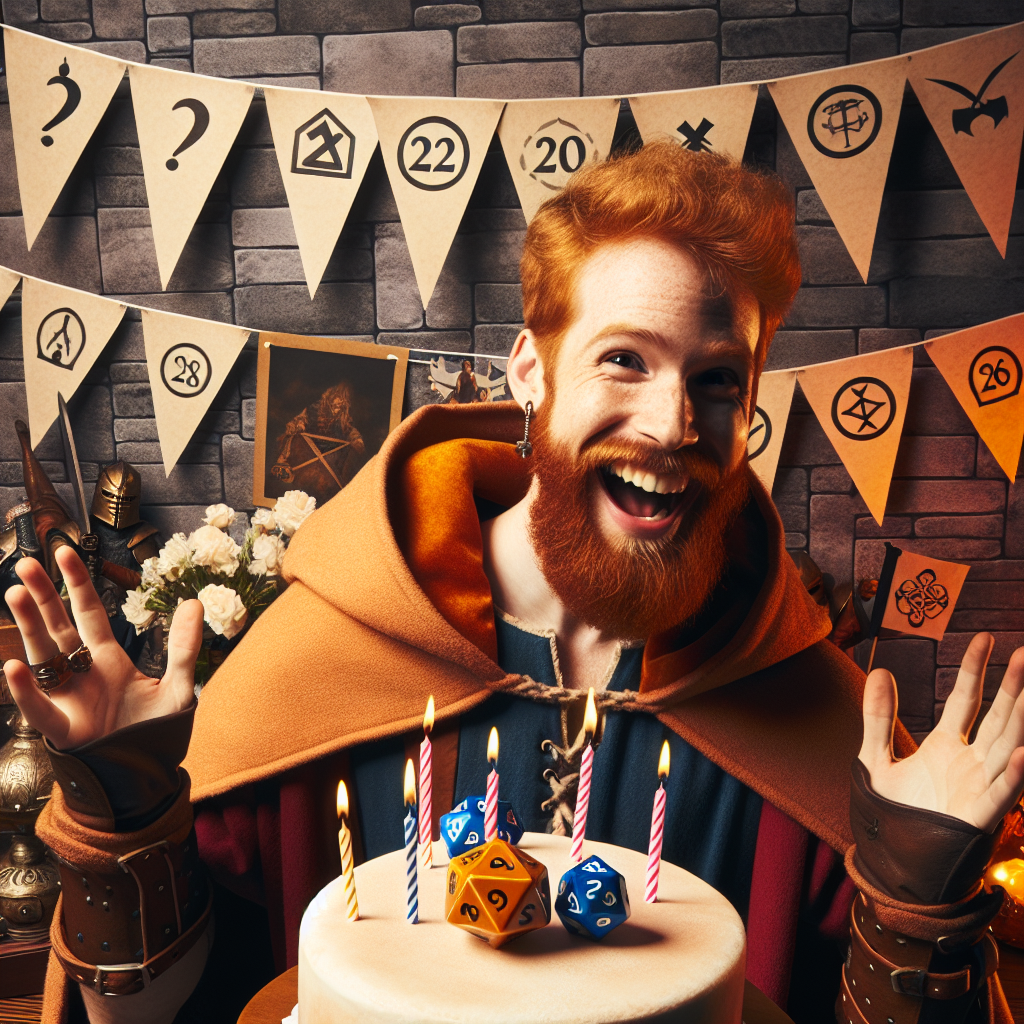 Imagine a festive atmosphere celebrating a 22nd birthday with a fantasy adventurer theme. An individual with ginger-beard, representing an anonymous yet recognizable figure from an admired adventuring group, is grinning widely. He is wearing a cloak with birthday symbols and has his hands on a 'critical hit' d20 dice. The party decorations include miniature flags with various symbols representing RPG character classes and a cake that features an elaborate icing design inspired by a popular role-playing game logo.