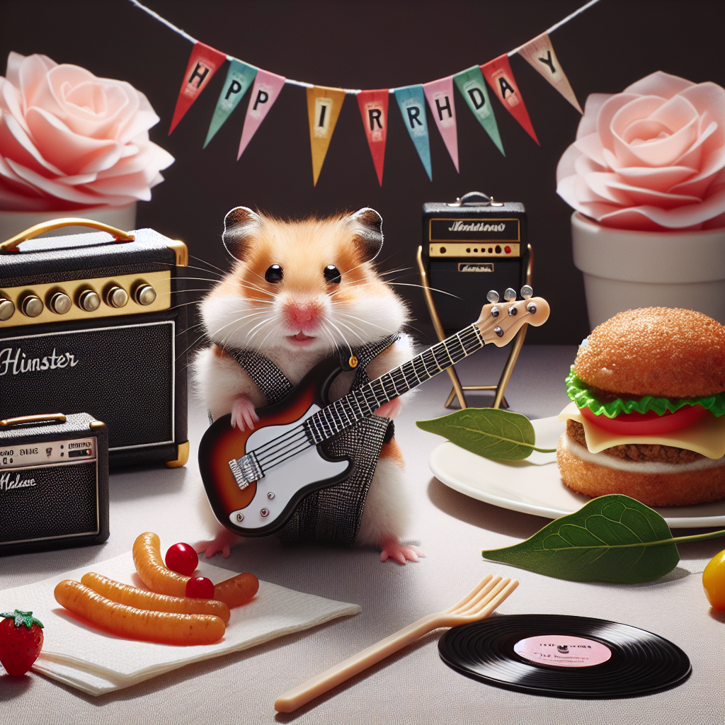 Design an image that embodies a delightful blend of rock music and playfulness for a birthday theme. At the center stage, a realistic hamster is the highlight, wearing diminutive rock-themed attire, complemented with a mini electric guitar straddled over its shoulder. The surroundings are adorned with mini amplifier and vinyl record motifs, underlining the rock-inspired theme. Food items represent refined versions of classic fast food meals with elegantly incorporate leaf garnishes. The scene radiates a whimsical yet rebellious aura, encapsulating the essence of a nonconventional birthday celebration.