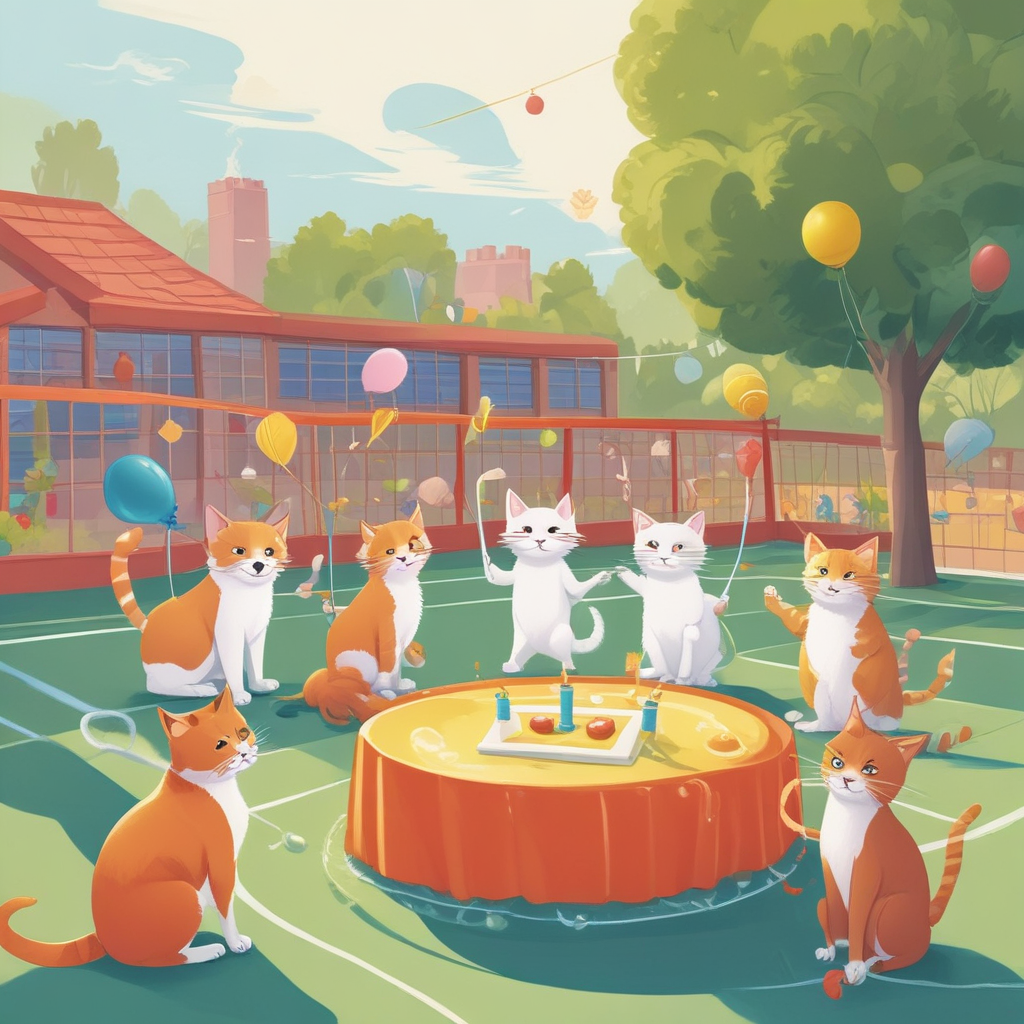 Illustration Cute, Draw a fanciful birthday image set on a sunny day at an outdoor tennis court where a bunch of charming cats are having a great time. There's a fluffy white kitten wearing a miniature party hat, fervently pursuing a tennis ball across the net. Meanwhile, another reddish feline, donning an impish smile, perches on top of a massive, colorful birthday cake situated at the side of the court, playing with the ribbons of a balloon bouquet that's designed after tennis rackets.