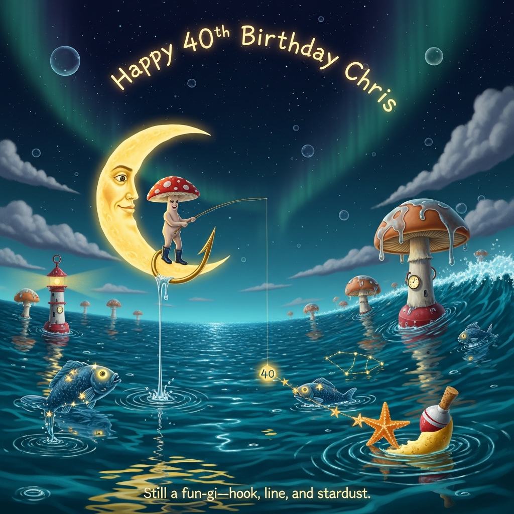 Dreamlike, Dali-inspired surreal seascape at night: a crescent moon bends like a golden fishing hook and doubles as a tiny boat, its tip drooping and dripping silver light into an indigo, bioluminescent ocean made of liquid starlight. A whimsical, red-and-white spotted mushroom person (fun-gi vibes) in tiny rubber boots balances on the moon-boat, casting a line baited with a small glowing “40” lure. Constellation-fish with twinkling eyes leap from the waves; starfish made of actual stars nibble the bait. Giant mushrooms rise from the ocean like buoy-lighthouses, their caps melting softly like clocks, reflecting ripples of turquoise and teal. The horizon curls impossibly; distant mushroom caps float like umbrellas among low drifting clouds. The sky is velvet midnight, speckled with oversized, softly pulsing stars; faint aurora swirls thread through them. Ethereal rim lighting, pearly highlights on wet caps, delicate stardust motes in the air; playful, absurd, and gently comedic.