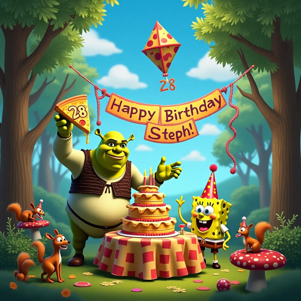 In the heart of an enchanting forest, where the trees tower like ancient guardians and dappled sunlight filters through the leaves, a jubilant birthday party unfolds. At the center of the scene stands a vibrant, round table covered with a bright, checkered tablecloth. On the table sits a majestic birthday cake, tiered and frosted in shades of emerald green reminiscent of Shrek's iconic hue. Atop the cake, the number "28" is proudly displayed in sparkling candles, and beside it, a banner that arches above the table reads "Happy Birthday Steph!" in bold, playful letters formed by an intertwining of colorful vines and flowers.