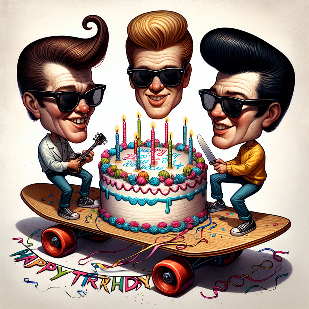 A whimsical birthday illustration presents three playful caricatures resembling anonymous 50s and 60s rock 'n' roll singers, gathered around a large, festive birthday cake perched atop a skateboard. The caricatures are crafted with exaggerated features to amplify their appeal. The caricature on the left, equipped with a pompadour hairstyle, is poise to cut the cake. The middle caricature's glasses glint in the light. The right caricature's iconic quiff is festooned with colorful birthday streamers. The incorporation of a skateboard adds a quirky twist to the vintage rock 'n' roll theme, inculcating a vibrant, youthful spirit.