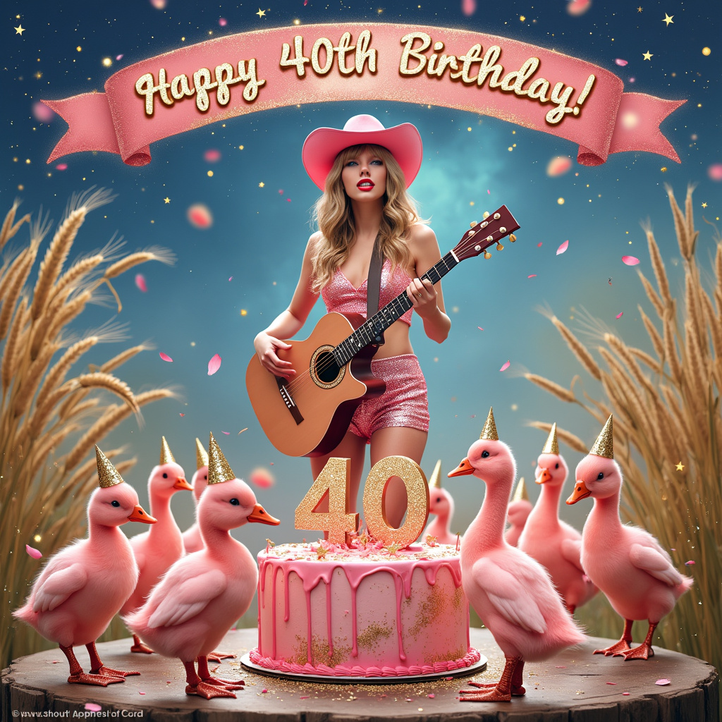 Generated with these themes: Happy 40th Birthday , Taylor swift, Pink ducks, Glitter , Sparkles, Cowboy hat, and Cowgirl boot .