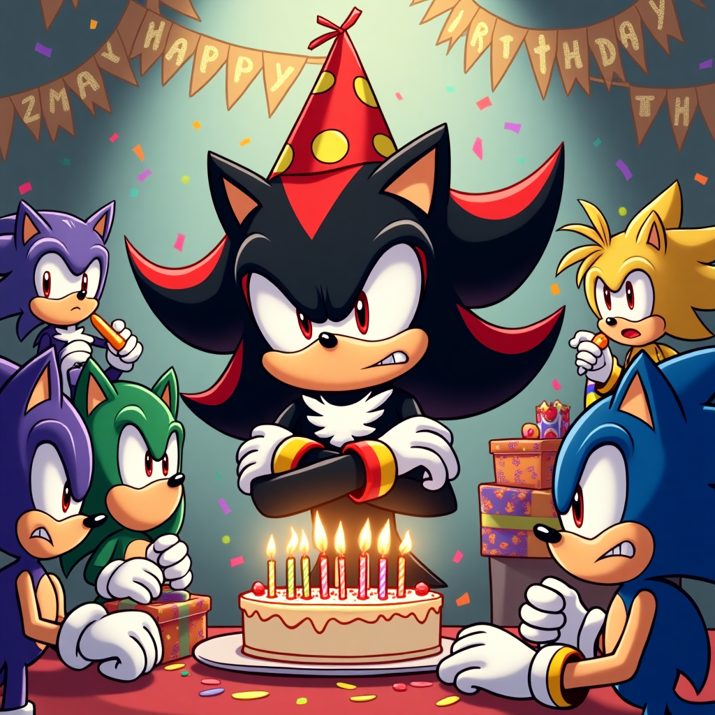 Create a funny cartoon image of Shadow the Hedgehog at a birthday party, clearly against his will — he’s slouched in a party hat with his arms crossed, surrounded by chaotic decorations and glittery “Happy Birthday!” banners. Around him, Sonic and friends are blowing noisemakers, throwing confetti, and giving him presents wrapped in ridiculous colors (think rainbows and kittens). Shadow looks mortified, a birthday cake in front of him with way too many candles (clearly overkill). One candle even looks like it’s started to singe his fur. The whole scene should ooze exaggerated cartoon silliness, full of contrast between Shadow’s moody vibe and the over-the-top cheerful birthday chaos.