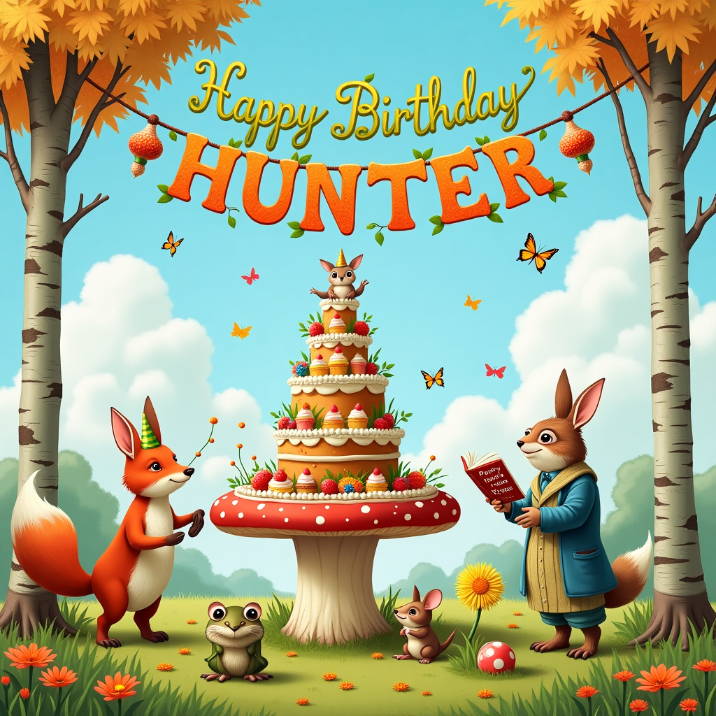 The illustration unfolds on a sunny, fantastical meadow where woodland creatures are throwing an elaborate birthday celebration for "Hunter." The foreground features a delightful, oversized toadstool acting as a whimsical table, laden with a delightful spread of colorful cupcakes, cookies, and a towering, multi-tiered cake. The cake is adorned with playful frosting flowers, and the top tier sports a miniature marzipan sculpture of a jubilant fox wearing a party hat. A banner, cleverly strung between two tall, slender birch trees, reads "Happy Birthday Hunter!" in flowing, vine-like script. The banner is made of bright autumn leaves, artistically arranged to form the letters.