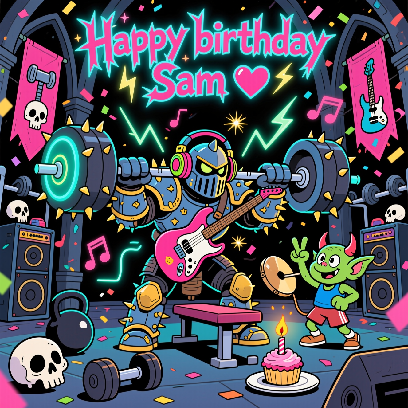 A playful cartoon scene with thick black outlines and bright saturated colors: inside a gothic sci‑fi gym that doubles as a metal concert stage, a hulking war‑knight in comically oversized, spiky power armor beams as he bench‑presses a ridiculous “barbell” made from a massive double‑headed warhammer fused to an electric guitar neck; the round weights look like glowing speaker cabs. He wears giant over‑ear headphones blasting tunes, with neon sound waves, musical notes, and crackling lightning bolts swirling around. A tiny green goblin‑ish spotter in gym shorts bounces beside the bench, throwing devil‑horn hand signs and banging a cymbal. Skull‑shaped kettlebells, spiky dumbbells, and a cupcake perched on a plate with a tiny flamethrower‑style candle add birthday chaos. Behind them, towering amp stacks and squat racks with pointed arches form a cathedral‑like backdrop; banners show crossed hammers and guitars (no words or logos). Confetti shaped like guitar picks rains down, sparks fly from the hammer, and bendy motion lines exaggerate the lift for comedy.