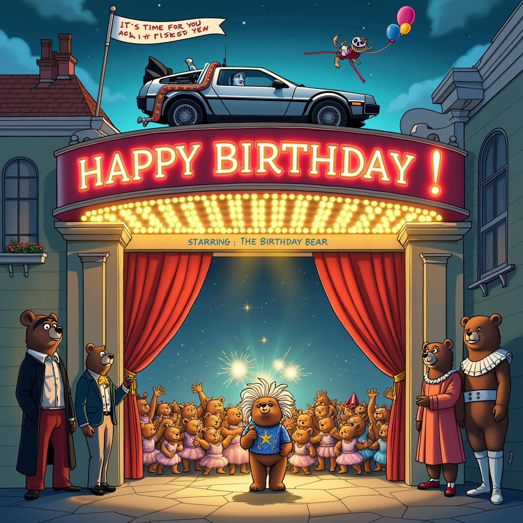 The front cover of this birthday greeting card depicts a bustling, whimsical theatre that looks straight out of a dream, with an aura of "Back to the Future" flair. The theatre marquee, glowing with bright neon lights, reads "Happy Birthday! Starring: The Birthday Bear!" Above the marquee, a DeLorean car, with its iconic gull-wing doors, is parked on the theatre's rooftop, appearing as if it has just time-traveled into the scene.