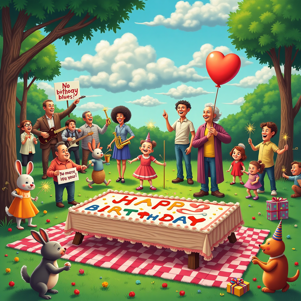 In this whimsical birthday scene, imagine a vibrant and playful park where caricatures of diverse individuals gather to celebrate Julia's birthday in an uproarious spectacle. In the foreground, there's a long picnic table covered in a checkered cloth, laden with an extravagant cake that spells out "Happy Birthday, Julia" in colorful frosting letters. The cake features a likeness of Julia holding a balloon shaped like a heart, symbolizing the love and unity of the gathering.