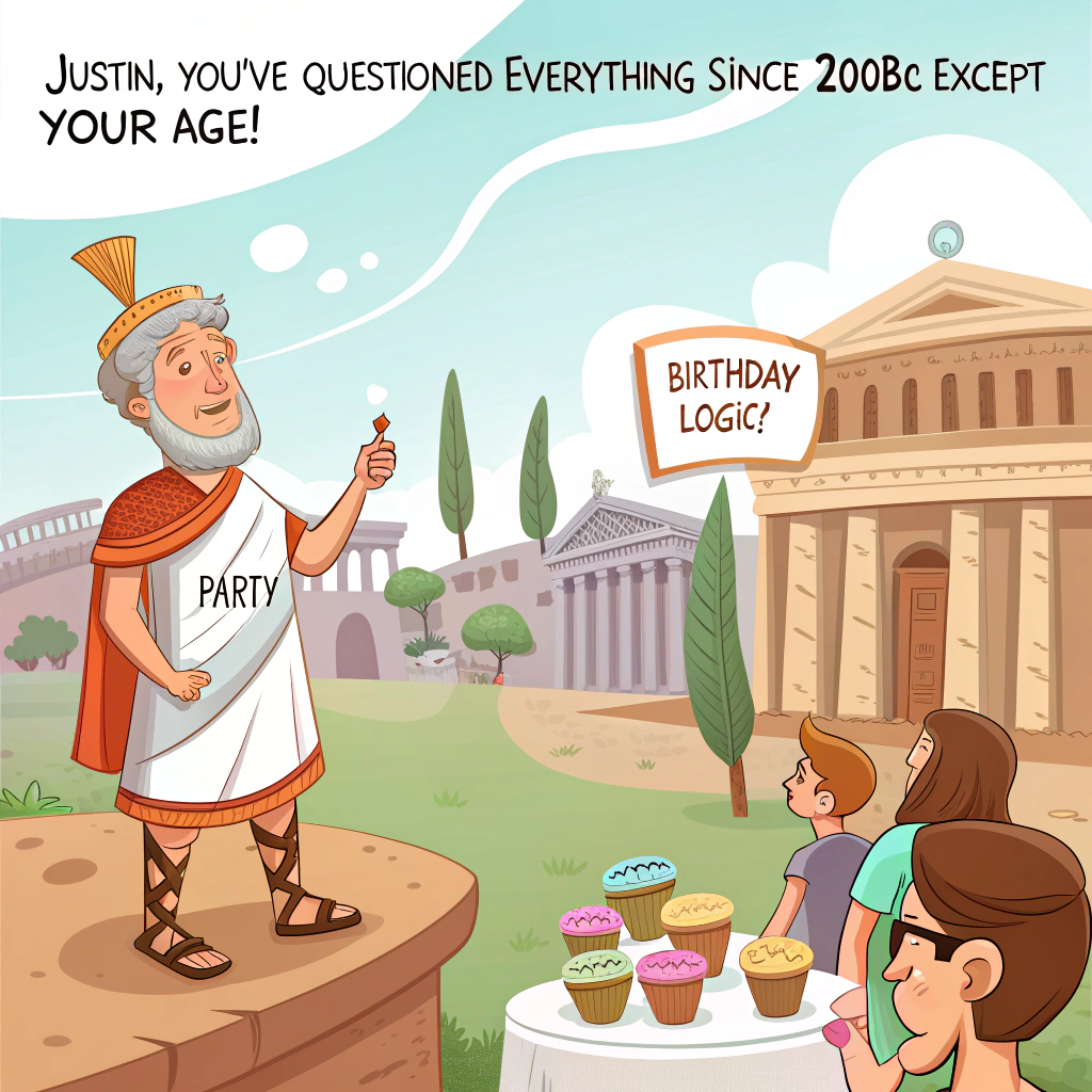At the top of the image, "Justin, you’ve questioned everything since 200BC – except your age!"