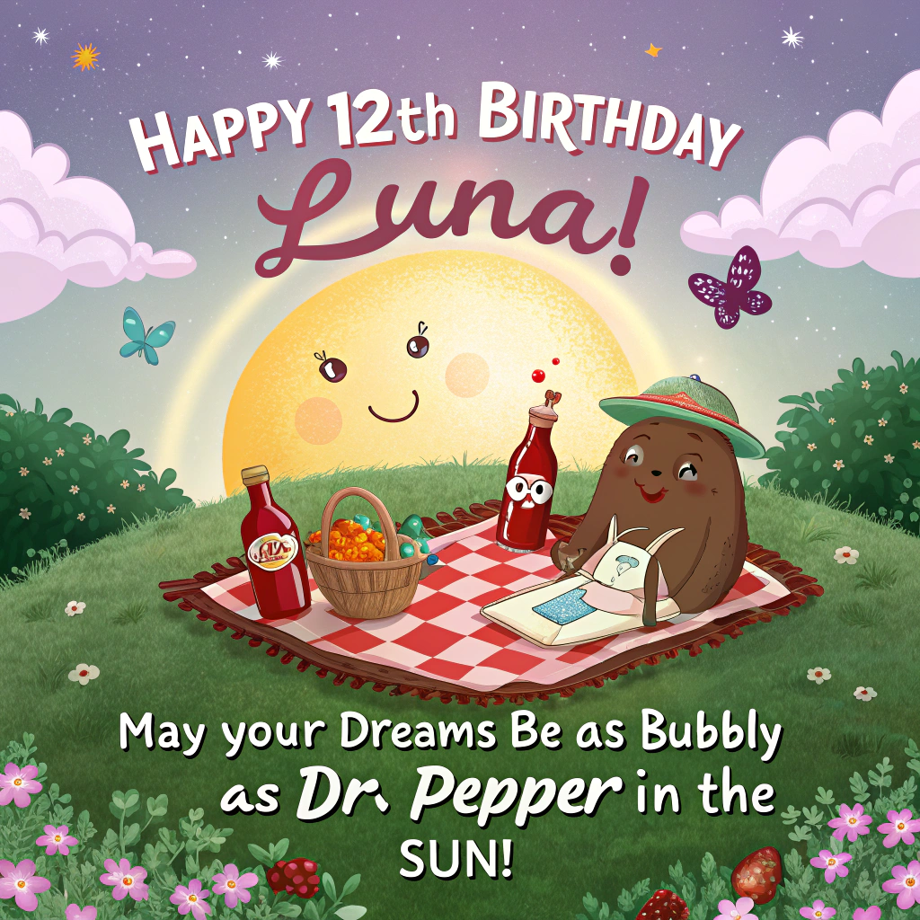 At the bottom of the image, "May your dreams be as bubbly as Dr Pepper in the sun!"