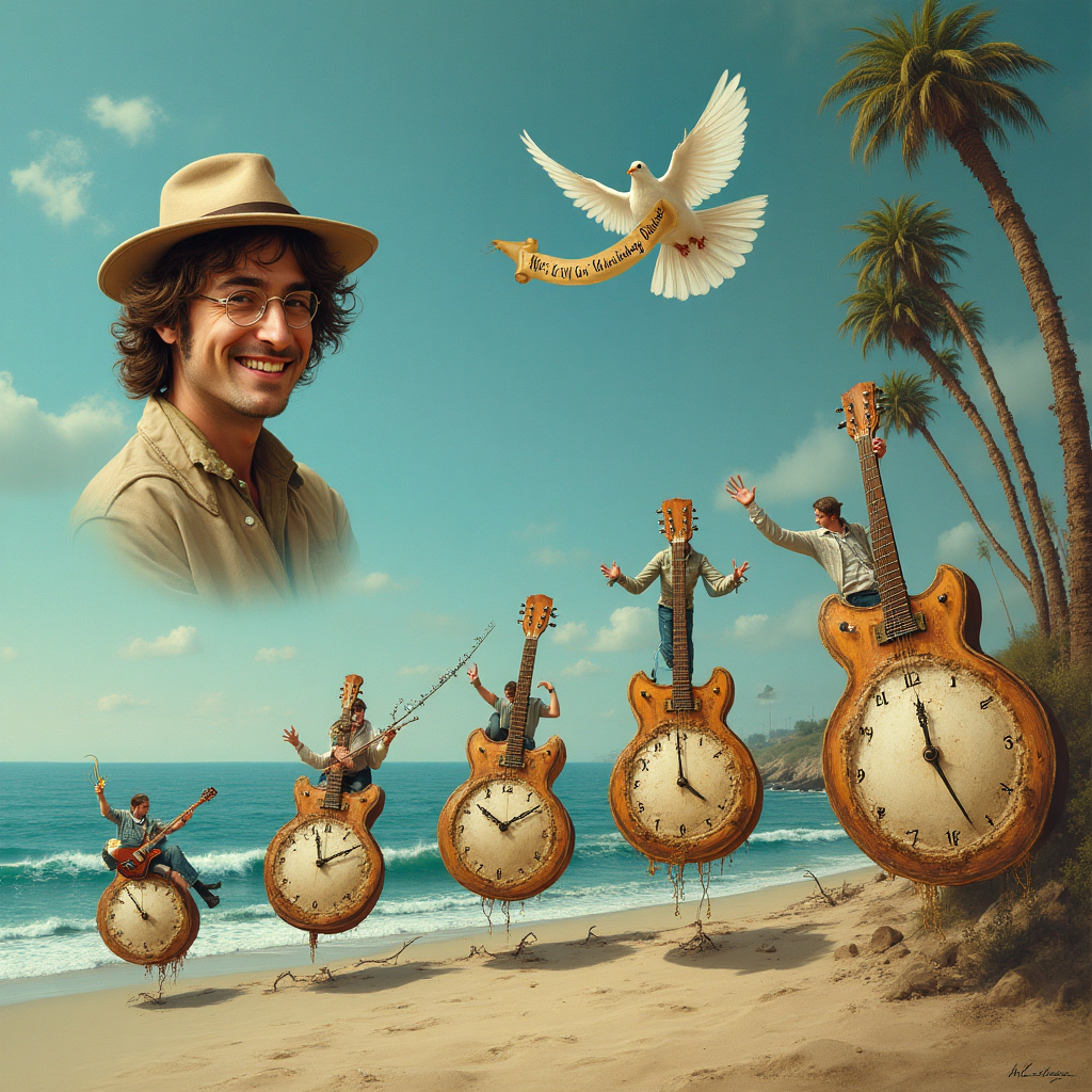 In a whimsical dreamscape, a floating portrait of John Lennon, styled by Avedon, grins cheekily while wearing an archeologist's hat, gazing down upon a timeline of quirky human evolution—depicted by melting clocks as DNA spirals. Each clock-face features a quirky character: a rock guitarist strumming strings made of lightning, an honest attorney balancing scales on a tightrope made of musical notes, a muscle man flexing his dreams into reality, and a devoted family man holding a golden heart. Venice Beach waves curl in the background, where guitars grow like trees, and a dapper dove flies by with a scroll reading: "Rock On, Birthday Dude!"