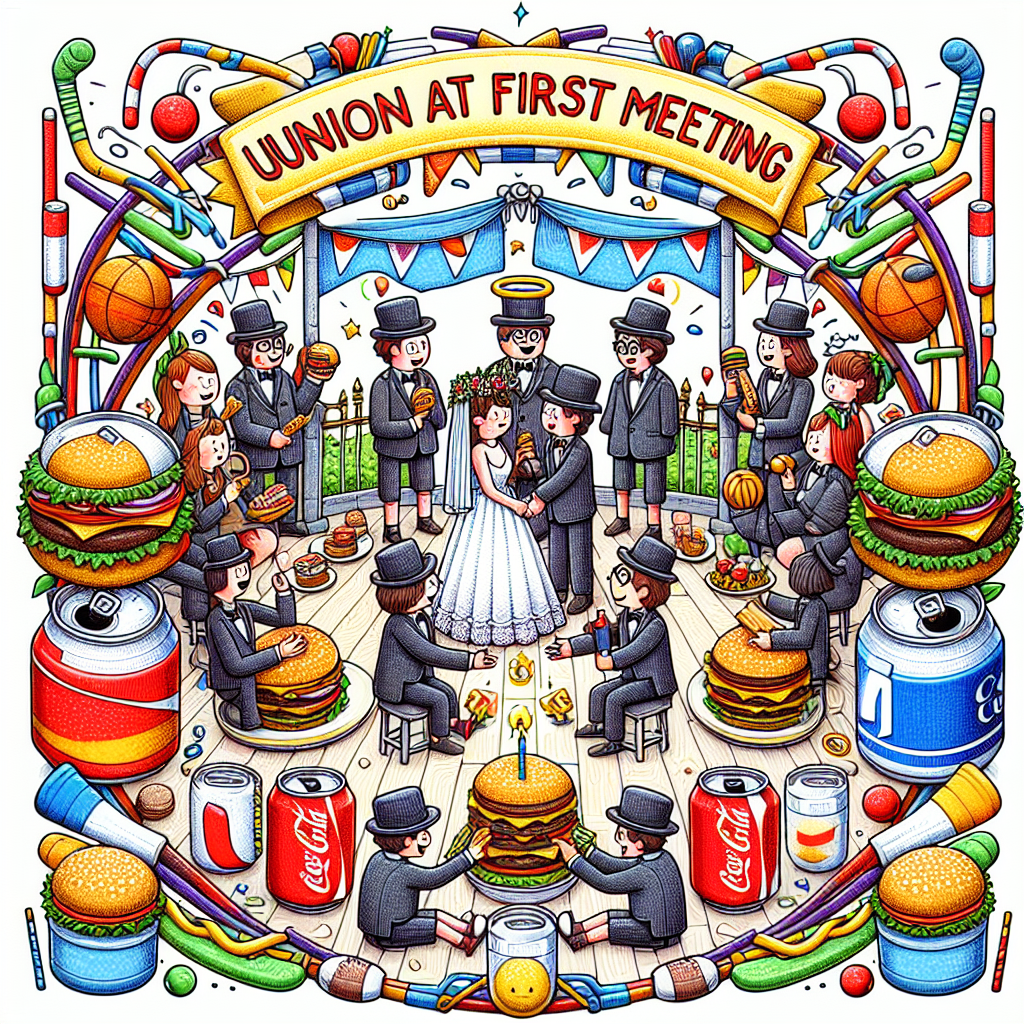 A captivating birthday illustration featuring a central scene of a fanciful union ceremony indicating 'Union at First Meeting'. Around them, characters relish delicious burgers and hold cans of generic cola. The border is beautifully decorated with sports equipment associated with ice hockey and netball, introducing a sports-related craftiness to the cheerful scene.