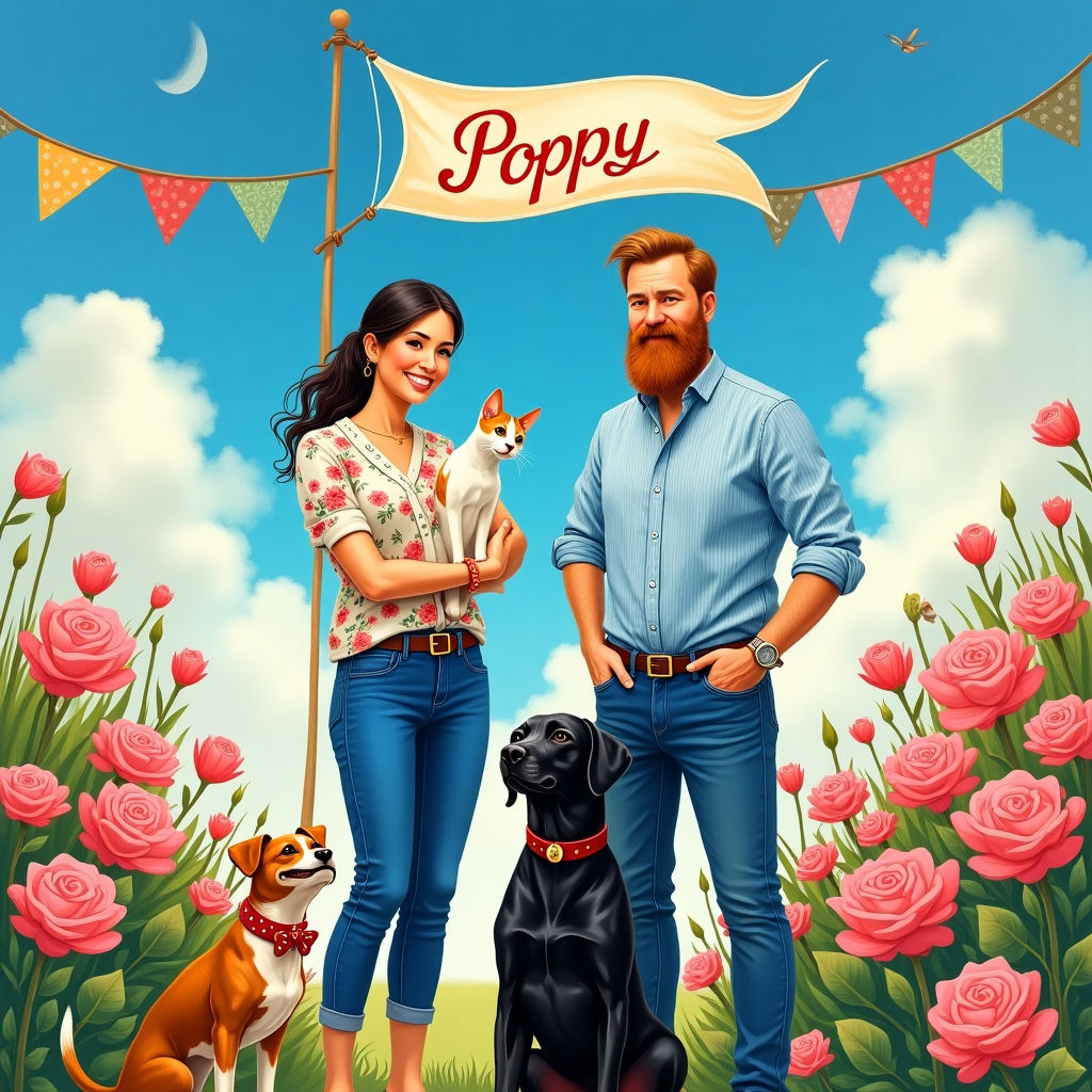 Generated with these themes: Thai lady in jeans, English man in blue shirt and short ginger beard, Lady has White skinny cat with ginger spots with red collar and bell, Lady has Small ginger chihuahua dog, Lady has Black labrador, and Pink roses.