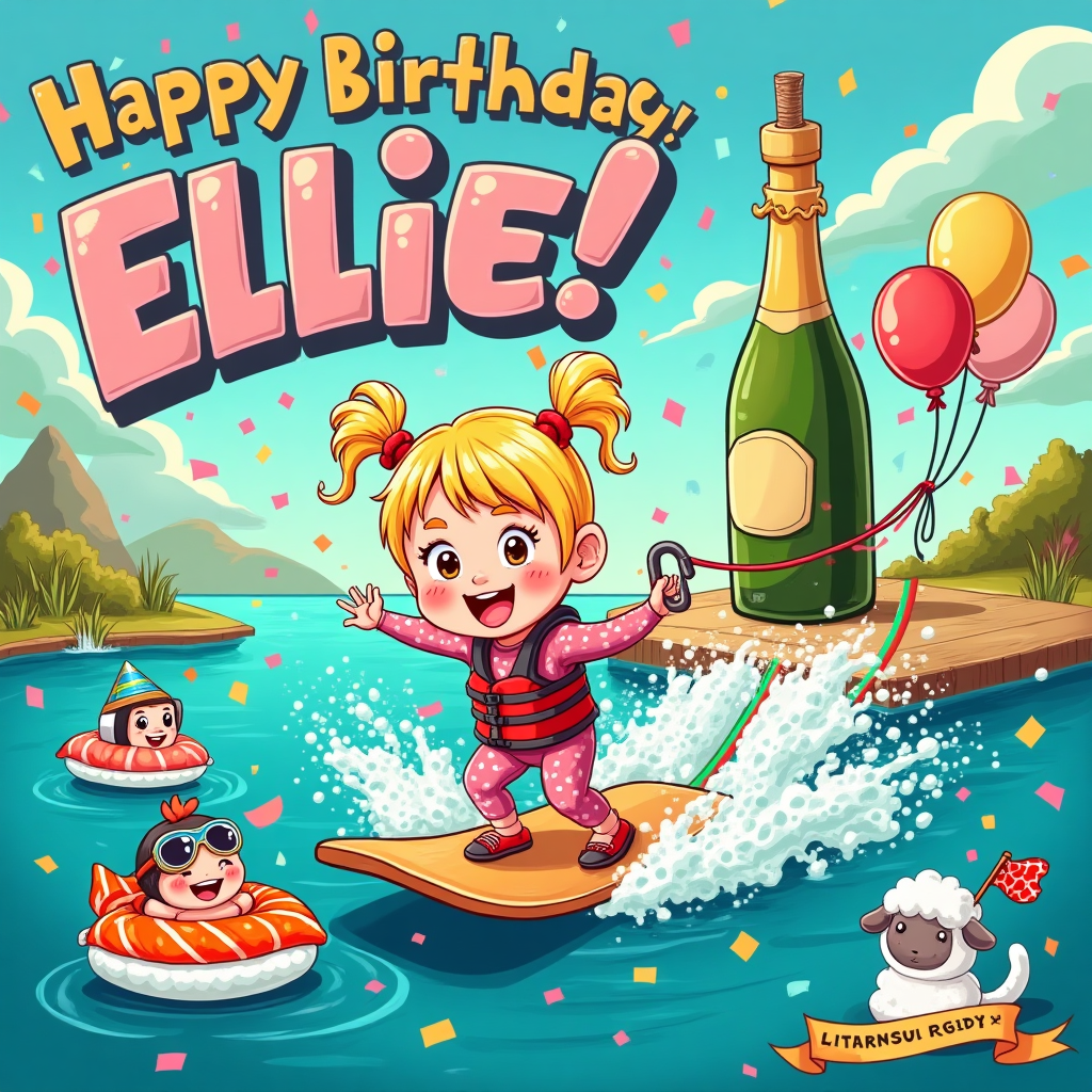 A bright, funny, full-bleed cartoon scene with exaggerated proportions, thick outlines, and saturated colors: Center stage, a blonde toddler girl with twinkly eyes and bouncy pigtails is joyfully wakeboarding on a golden, fizzy confetti wave created by a giant party champagne bottle in the back (popped cork flying, sparkling spray arcing forward to form the “wave,” bottle safely on a decorated table with balloons). She wears a tiny life vest and polka-dot wetsuit, grinning, holding a chunky crochet hook as her tow handle; the tow rope is a rainbow strand of yarn looping playfully through the scene. Beside her, a chubby baby with goggles giggles from a sushi-shaped floaty (smiling salmon nigiri ring), splashing in the bubbly stream.