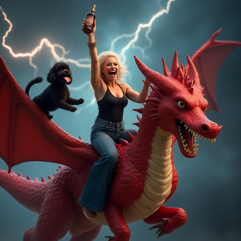 Create an ultra-high-definition 4K UHD photograph capturing an exhilarating scene of Mandie joyously riding Meleys, the large red dragon from the House of Dragon TV show. Mandie, exuding confidence and flair, is dressed in flared jeans and a black vest top. Her expression is one of pure delight as she sings ABBA tunes into a bottle of Disaronno she's holding aloft.