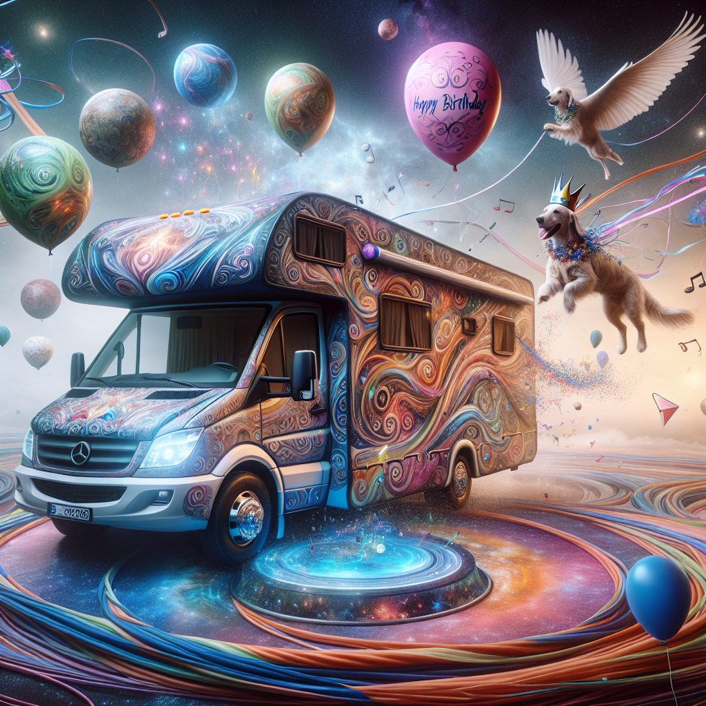 Imagine a fantasy landscape with a motorhome at the center - it's covered in intricate swirling designs and radiant lights, suspended mid-air with no clear support. This motorhome, appearing in motion, is caught in a swirl of colourful confetti and balloons that mimic the shapes of celestial bodies. A winged canine frolics around the vehicle, donning a majestic crown and a sash bearing the words ‘Happy Birthday’. It seems as if this surreal, dreamlike universe celebrates a perpetual birthday where the norms of time and space are gleefully dismissed.