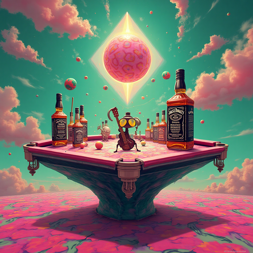 Create a vibrant, whimsical composition combining iconic elements from Pink Floyd, Snooker, and Jack Daniels. Imagine a surreal, geometric landscape where a giant snooker table hovers in the sky like a psychedelic floating island. The surface of the table is made up of vivid pink and green abstract patterns reminiscent of Pink Floyd's album covers.