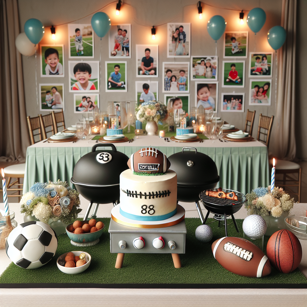 Visualize a lovely birthday celebration setup that nicely combines the elements of cuteness and authenticity. In the middle, a football-themed cake is present, complemented by BBQ grill centerpieces in small sizes around it. The tables are beautified with linens in hues of white and green, subtly suggesting a golf course theme. The ambiance is decorated with sport-related ornaments such as miniature soccer balls, basketballs, and golf clubs. Amplifying the familial warmth, a backdrop is set with a collection of unposed family photos, capturing cherished moments related to sports.