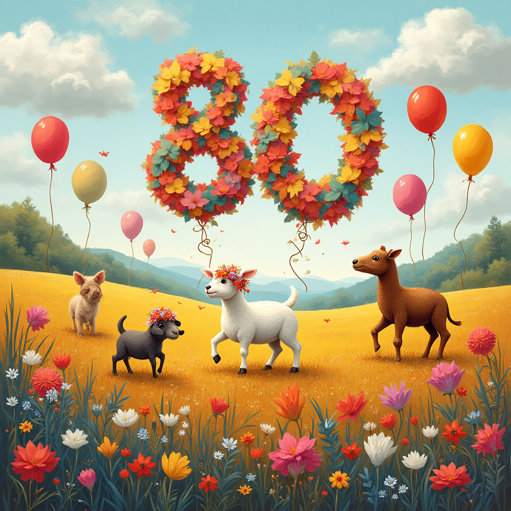 In the center, a whimsical lamb adorned with a delicate crown of vibrant flowers prances joyfully. Nearby, a playful puppy and a charming camel join in the celebration, their figures crafted with expressive brush-stroke textures.
