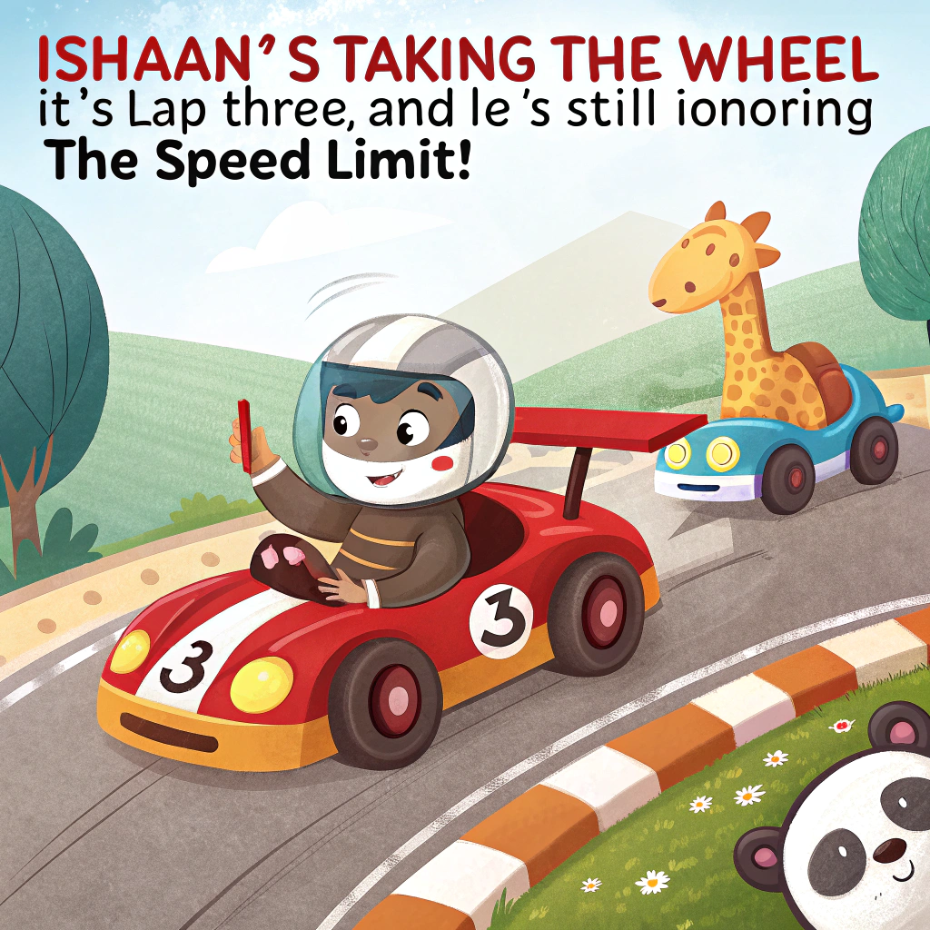 At the top of the image, "Ishaan’s taking the wheel – it’s lap three, and he’s still ignoring the speed limit!"