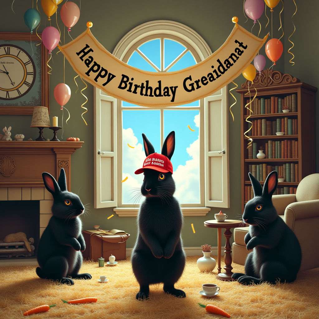 Inside a whimsically cluttered living room, a tapestry of surreal elements unfurls to tell the story. The carpet is whimsically replaced with a layer of fresh golden hay, scattered across the floor like the sunlit beams of a forgotten barn. Three black rabbits occupy this unusual setting, their presence both charming and peculiar. The central figure, an assertive black rabbit, stands confidently on its hind legs, adorned with a vibrant red cap embroidered with the slogan "Make Rabbits Great Again" in bold, white letters. The rabbit's eyes glint with an ambitious spark as if rallying a silent audience.