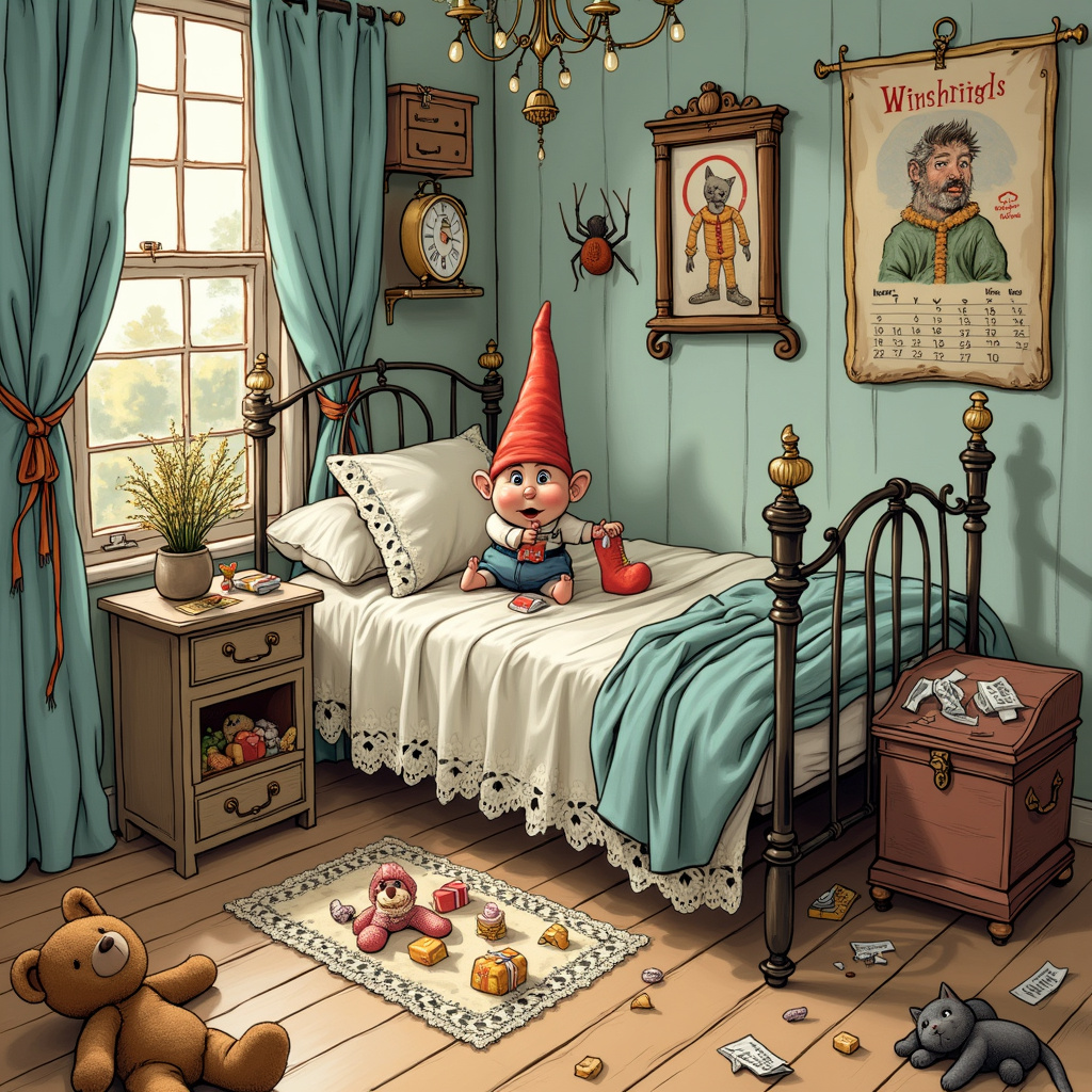 On the bed, a playful tableau unfolds: a cheeky gnome-like creature, perhaps inspired by Arthur Rackham's impish figures, is caught in the act of sneaking away with another sock. His expression is one of mischievous delight, with twinkling eyes and a wide grin, clearly enjoying his pilfered prize. The details of his tiny shoes and pointed hat are lovingly rendered, adding to the charm of the scene.