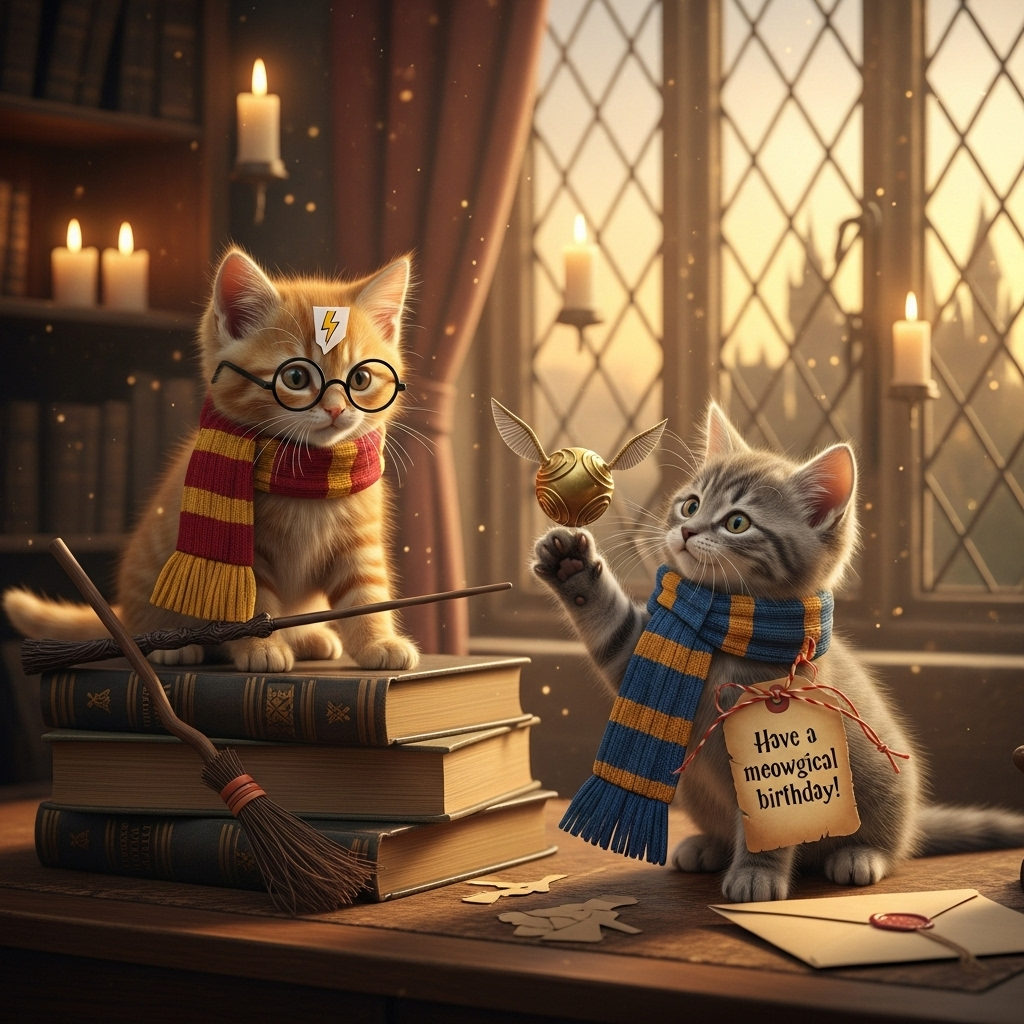 Ultra-high-definition 4K photorealistic photograph, cute mood: Two fluffy kittens in a Harry Potter–inspired wizarding dormitory scene. One ginger kitten wears tiny round black glasses and a red-and-gold striped scarf with a small paper lightning-bolt sticker tucked above the frames; a grey tabby in a blue-and-bronze scarf bats at a tiny golden snitch toy. They’re perched on a stack of weathered spell books on a vintage wooden desk beside a leaded-glass window; warm golden-hour light streams through dust motes, with creamy bokeh of floating candles and a distant gothic castle silhouette outside. A slender wand rests under a soft paw, a miniature broom leans against the books, and an open parchment envelope with a red wax seal sits nearby. Lifelike fur and wool textures, crisp whiskers, wet nose sheen, realistic materials, rich depth of field. Subtle cinematic color grading in warm ambers and golds, cozy and whimsical.