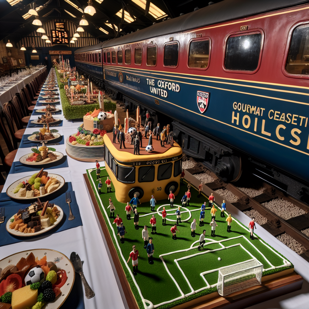Envision a station-themed venue filled with laughter, its main attraction being a vintage diesel train from UK railways that has been brilliantly converted into dining booths. This area is festively decorated with memorabilia from the Oxford United football team, adding to the joyful atmosphere. A buffet table laden with gourmet British cuisine commands attention, each dish intriguingly named after railway jargon. In the middle is a highlight: a birthday cake sculpted to resemble a football pitch, with little edible figures representing Oxford United players scattered atop.