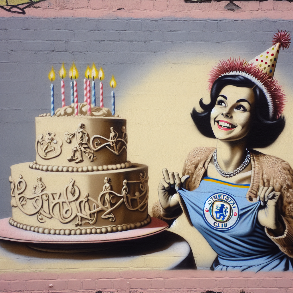 A fanciful birthday depiction featuring a joyful woman with dark hair. She is Caucasian and is dressed in a playful party hat and clothes ornately decorated with a football club logo, indicating her love for the sport. The scene unfolds against a sweet, pastel backdrop. Taking central stage is a delectable cake crowned with flickering candles. To add an innovative touch, the wall backdrop carries a subtle stencil graffiti reminiscent of early 20th-century satire art, ingeniously interweaving birthday symbols within its composition.