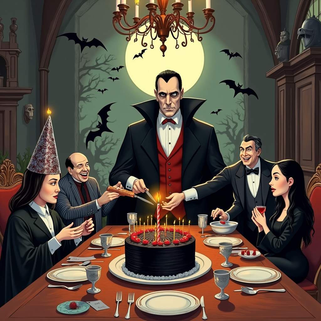 At the center of the table, Dracula himself, complete with his classic black cape and widow's peak, is cutting into a giant, bat-shaped birthday cake, black frosting oozing like a deliciously eerie waterfall. Lurch, towering behind Dracula, is holding a silver tray with goblets filled with what looks suspiciously like tomato juice.