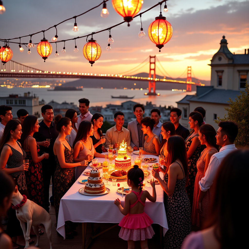In the background, the sound of cable cars clanging down the streets below adds an authentic San Francisco touch. The entire rooftop is alive with the buzz of celebration, the spirit of community, and the blending of cultures, all under a sky painted with the mesmerizing colors of a West Coast twilight.