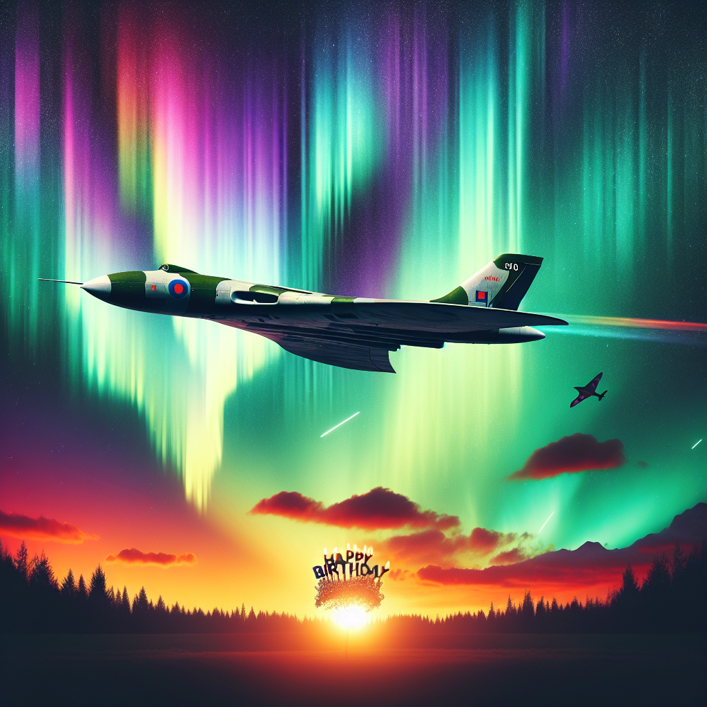 Create a captivating surreal illustration that depicts a unique birthday celebration. In the sky, the Northern Lights are cascading in vibrant hues of green and purple, blending seamlessly with the colorful streaks of an early morning sunrise. Silhouetted against this breathtaking backdrop, an iconic Avro Vulcan airplane is flying gracefully, its sleek form casting an intriguing shadow over the ethereal landscape. The combination of these elements creates an atmosphere of wonder and awe perfect for a birthday celebration.