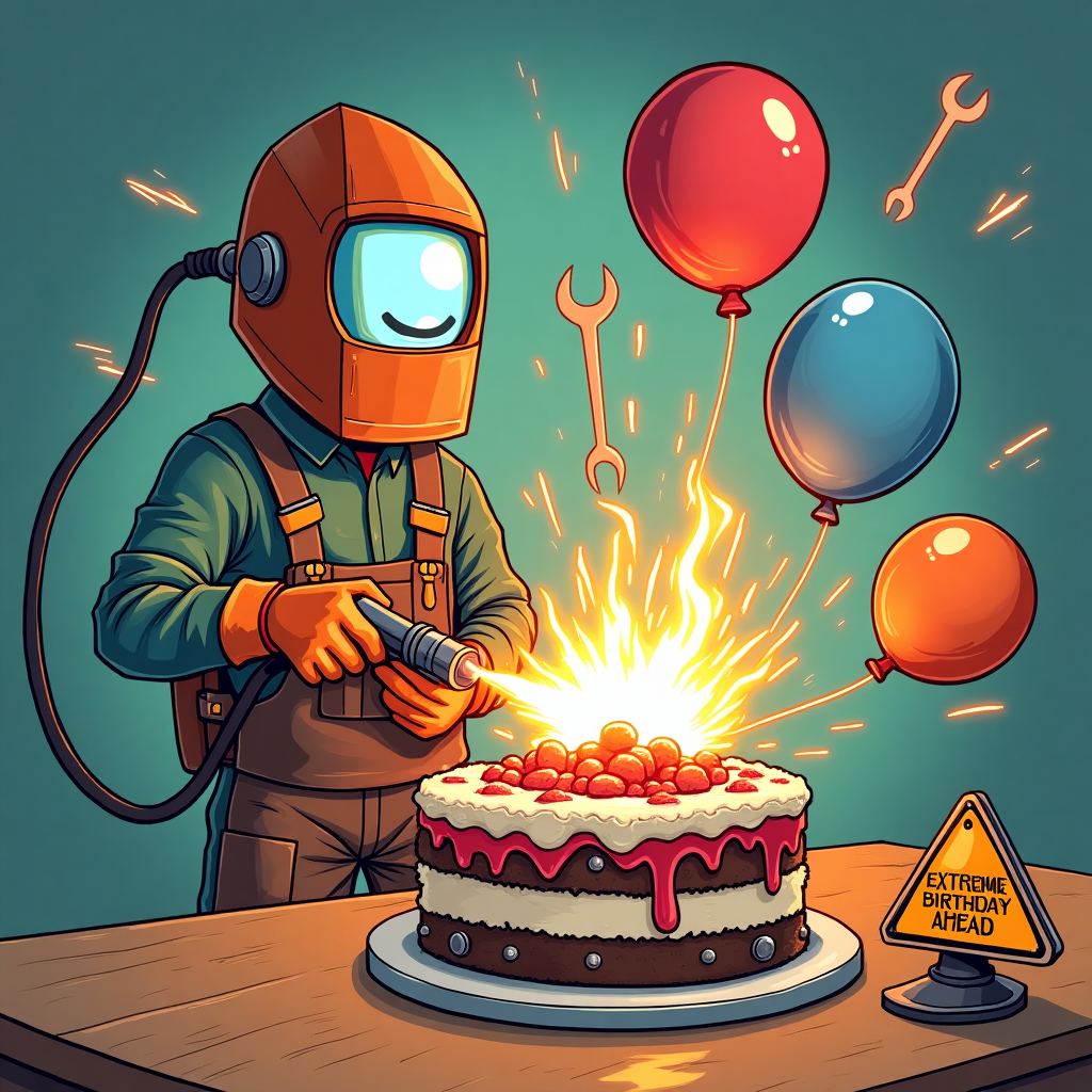 A comical, colorful illustration of a welder mid-birthday celebration. Bryce, dressed in full welding gear—mask flipped up to reveal a cheeky grin—is using a welding torch to "cut" the first slice from an enormous birthday cake. The cake has metal layers, gears, and rivets, and frosting dripping like molten steel. Sparks are flying dramatically (but safely), illuminating floating balloons shaped like wrenches and toolboxes. A “CAUTION: Extreme Birthday Ahead!” sign leans against the table. The overall mood is hilariously explosive, perfect for a laugh.