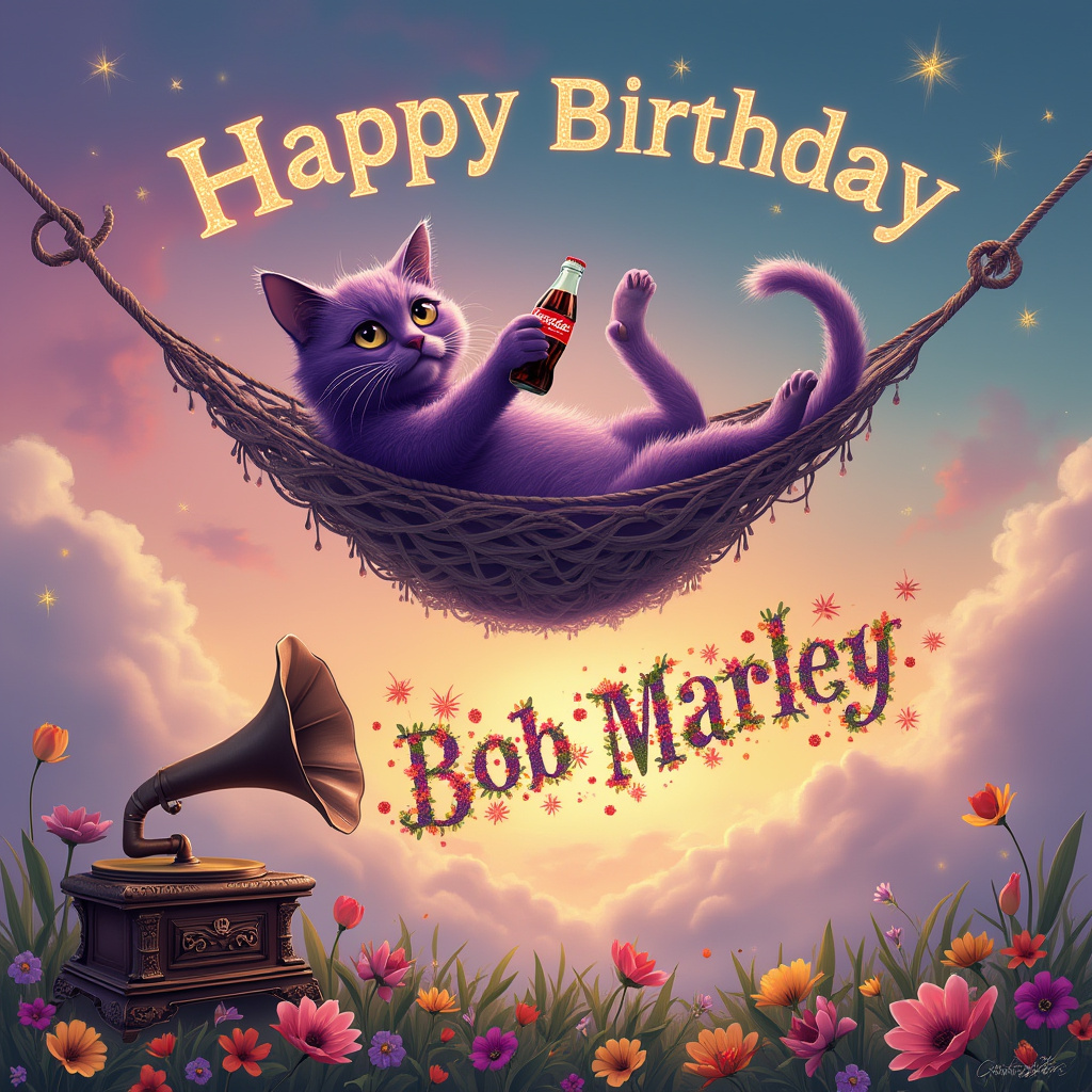In the vibrant realm of this birthday greeting card, imagine a sky painted with hues of twilight – a blend of soft pinks and deep purples, as if the sunset decided to linger a little longer just for this occasion. Hovering against this colorful backdrop is a whimsical, purple-furred cat, complete with feathery wings that shimmer with a touch of glitter, giving it a magical, almost ethereal presence. The cat is mid-flight, casually reclining in an invisible hammock woven from clouds, its tail playfully curling into a loop-the-loop. Clutched in its paws is a classic glass Coca-Cola bottle, the iconic red label gleaming under the celestial glow, with bubbles rising in a cheerful fizz as the cat takes a delightful sip. Below this enchanting spectacle, a field of fluffy white clouds forms the foreground, each one meticulously shaped into different musical instruments – a nod to the reggae legacy of Bob Marley. Amongst these clouds, an ornate, vintage gramophone is gently spinning, emitting musical notes that weave themselves into the air, transforming into a vibrant "Happy Birthday Bob Marley" banner that floats gracefully across the sky. The letters of the message are cleverly crafted from a rainbow of exotic flowers, their petals ruffled by the soft breeze, adding a burst of color to the scene. Scattered throughout the sky are tiny twinkling stars that seem to pulse in rhythm with the music, completing this dreamy, whimsical birthday celebration.