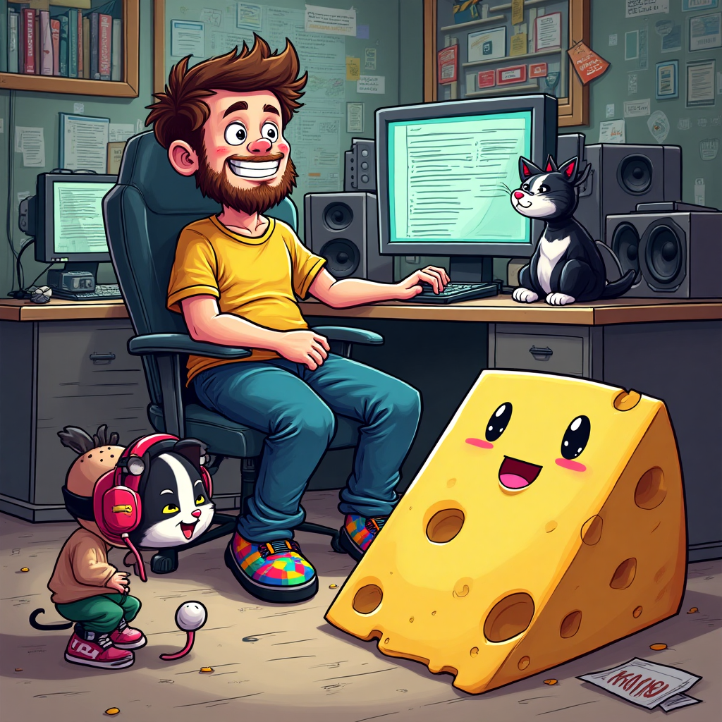In a vibrant, cartoon style, picture a 35-year-old man with a cheeky grin and stubble, sporting oversized, colorful slippers while sitting at a cluttered desk covered with computer coding books and screens displaying lines of code. His animated black and white cat is playfully batting at a computer mouse, with one eye closed in concentration. Nearby, a baby wearing oversized headphones bounces gleefully to the beats of dubstep music playing from an exaggeratedly large speaker. In the foreground, a giant wedge of cheese, complete with cartoon eyes and a big cheesy smile, seems to be nodding along to the music. Bright, saturated colors, thick outlines, and exaggerated proportions bring this lively, whimsical scene to life. At the bottom of the image, a cheeky line reads, "Debugging Life with Cheese and Beats!"