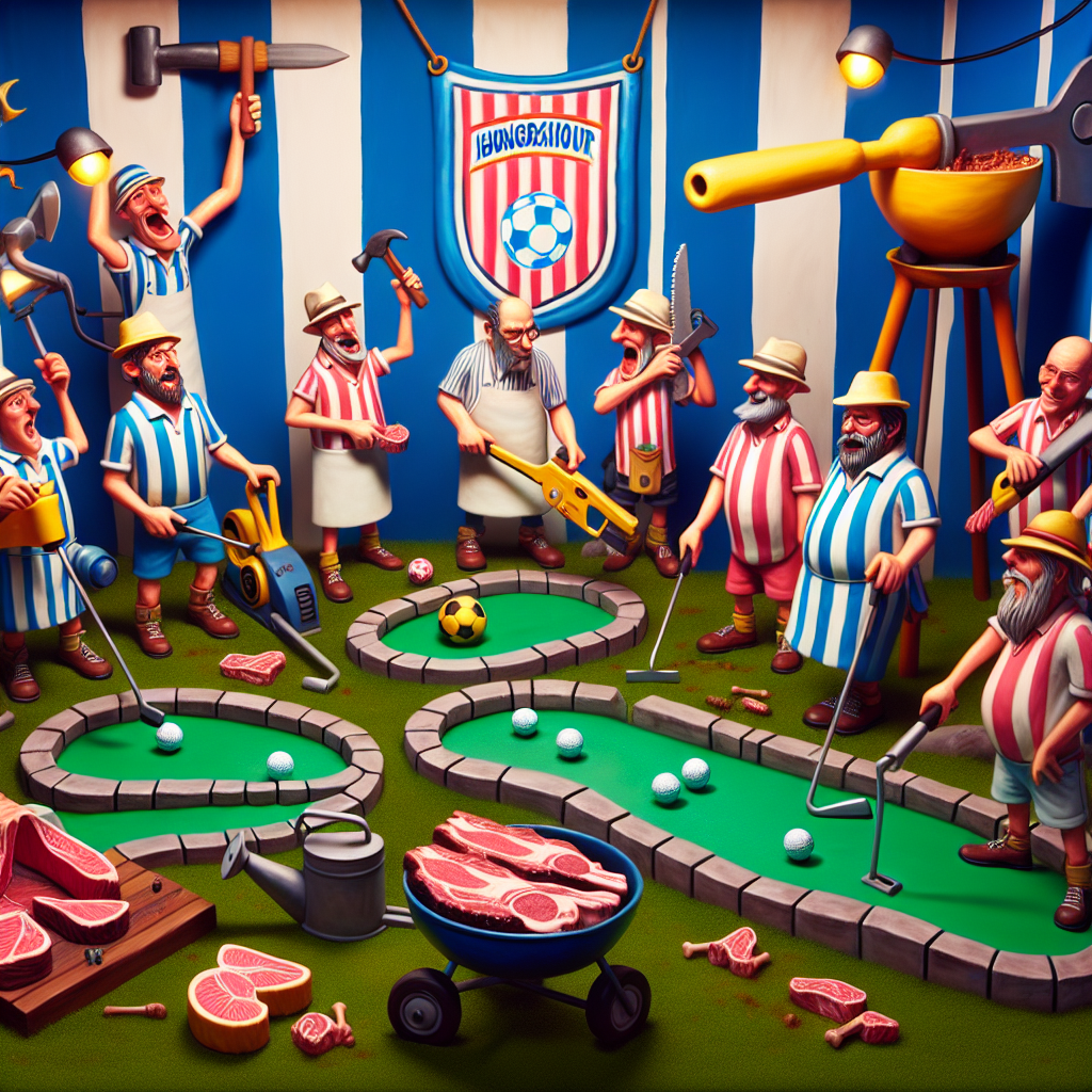 The scene paints a whimsical birthday setup where fantastical characters assemble around a mini golf course, themed after a popular soccer club. Each hole is ingeniously fashioned with tools commonly found in a handyman's kit, from drills to saws, embedding these elements into the fun-filled course. An energetic grill, animated with succulent steaks fluttering nearby, commands the attention of spectators clothed in the iconic club colors, cheering passionately for the players. A flag symbolizing loyalty towards the soccer club flutters in the background, tastefully tying the birthday theme together.
