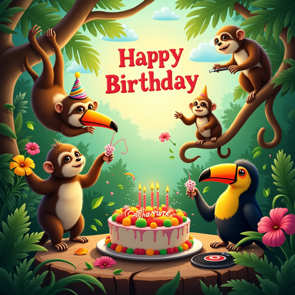 Picture a whimsical and lush Costa Rican jungle, bathed in the warm glow of a late afternoon sun that casts golden highlights on everything it touches. In the center of this vibrant setting is a quirky birthday party unfolding amidst the tropical foliage. A playful sloth is lazily hanging upside down from a sturdy branch, wearing a tiny, colorful party hat perched on its head. Nearby, a troupe of energetic monkeys is enthusiastically decorating a jungle-themed birthday cake with tropical fruits and vibrant edible flowers, the word "Catherine" prominently spelled out in rainbow-colored icing on the cake's top. A majestic toucan, with its strikingly large and colorful beak, acts as a DJ perched atop a tree stump, spinning a vinyl record with its beak. Meanwhile, a bevy of tiny, iridescent hummingbirds flit around, some holding mini streamers in their delicate beaks, which sway and twinkle in the light. Above, in the sky, the word "Happy Birthday" is cleverly crafted by a parade of fluffy clouds, with one distinct cloud shaped like the letter "C" for Catherine, making it clear whom the celebration honors. The jungle is a riot of colors with lush green leaves, vividly colored flowers, and the creatures' vibrant plumage, creating a scene that is both chaotic and delightful, capturing the essence of a unique and joyous birthday celebration in the heart of Costa Rica.
