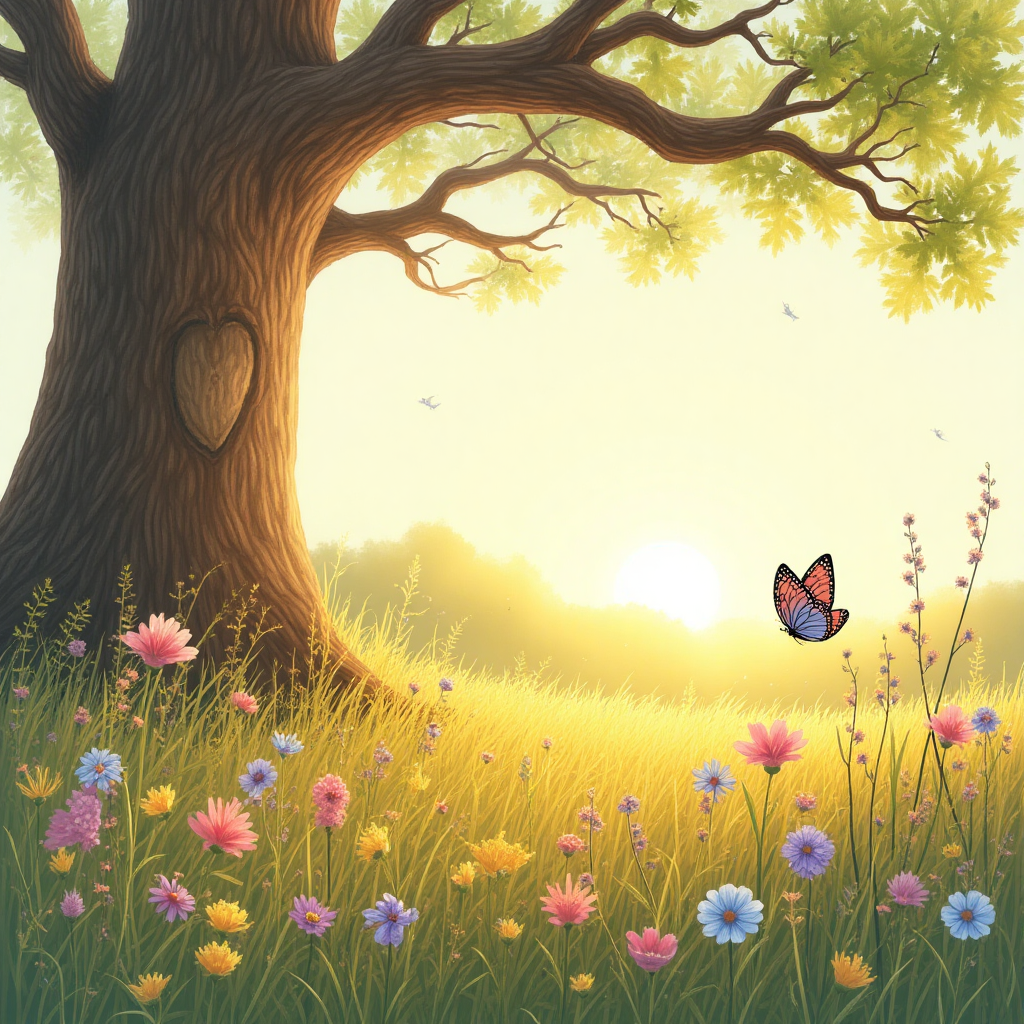 A serene meadow at dawn, where the first light of day bathes everything in a soft golden glow. In the foreground, a whimsical collection of delicate wildflowers sways gently in a gentle breeze, their colors a tapestry of lavender, soft pink, and buttery yellow. Among them, a small butterfly flits gracefully, its wings a masterpiece of azure and coral hues, symbolizing the fleeting beauty and joy of life. In the background, a grand old oak tree stands sentinel, its branches reaching out like welcoming arms. Its trunk is adorned with a subtle carving of a heart, with an arrow through it, etched by time and nature's touch. Above this scene, in elegant hand-drawn lettering, the words, "Another Year, Another Adventure Awaits!" capture the essence of celebration and hope.