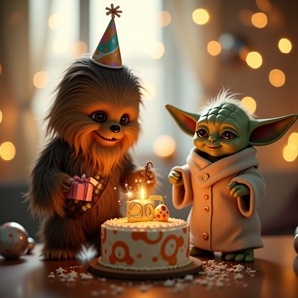 Ultra-high-definition 4K UHD, photorealistic, cute and heartwarming. Vertical portrait orientation. A cozy birthday party scene with Star Wars icons in lifelike detail: Chewbacca crouches into the frame with a big warm grin, wearing a tiny colorful party hat and holding a ribbon-wrapped gift; beside him, Yoda stands on a small wooden stool to reach a galaxy-swirled birthday cake with a glowing “50” sparkler, cheeks puffed as if about to blow; BB-8 rolls up front-and-center with a miniature cone hat and a satin bow, confetti gently scattered across its glossy orange-and-white panels. Background: soft golden string lights and silver–gold star-shaped balloons create dreamy bokeh; subtle star confetti floats in the air. Lighting: warm, natural, and directional, soft window-like key light with gentle rim light catching BB-8’s metal and Chewbacca’s fur; candlelight adds a cozy glow to Yoda’s face. Textures: individual Wookiee fur strands, delicate linen weave in Yoda’s robe, realistic weathering and reflections on BB-8. Composition: inviting group portrait at eye level with Yoda, cake slightly foregrounded, characters close and affectionate for an adorable vibe. Color palette: warm ambers, soft pastels, and metallic accents. Camera specs: full-frame, 50mm lens, f/1.8, ISO 200, 1/125s, shallow depth of field with rich, creamy bokeh. Clean, sharp focus on faces and cake, no motion blur. Stylize the top text in playful starry gold-and-white lettering with a gentle glow and soft bevel so it’s legible against the background; the bottom caption in a small, friendly handwritten script. No extra text, no logos, no watermarks.