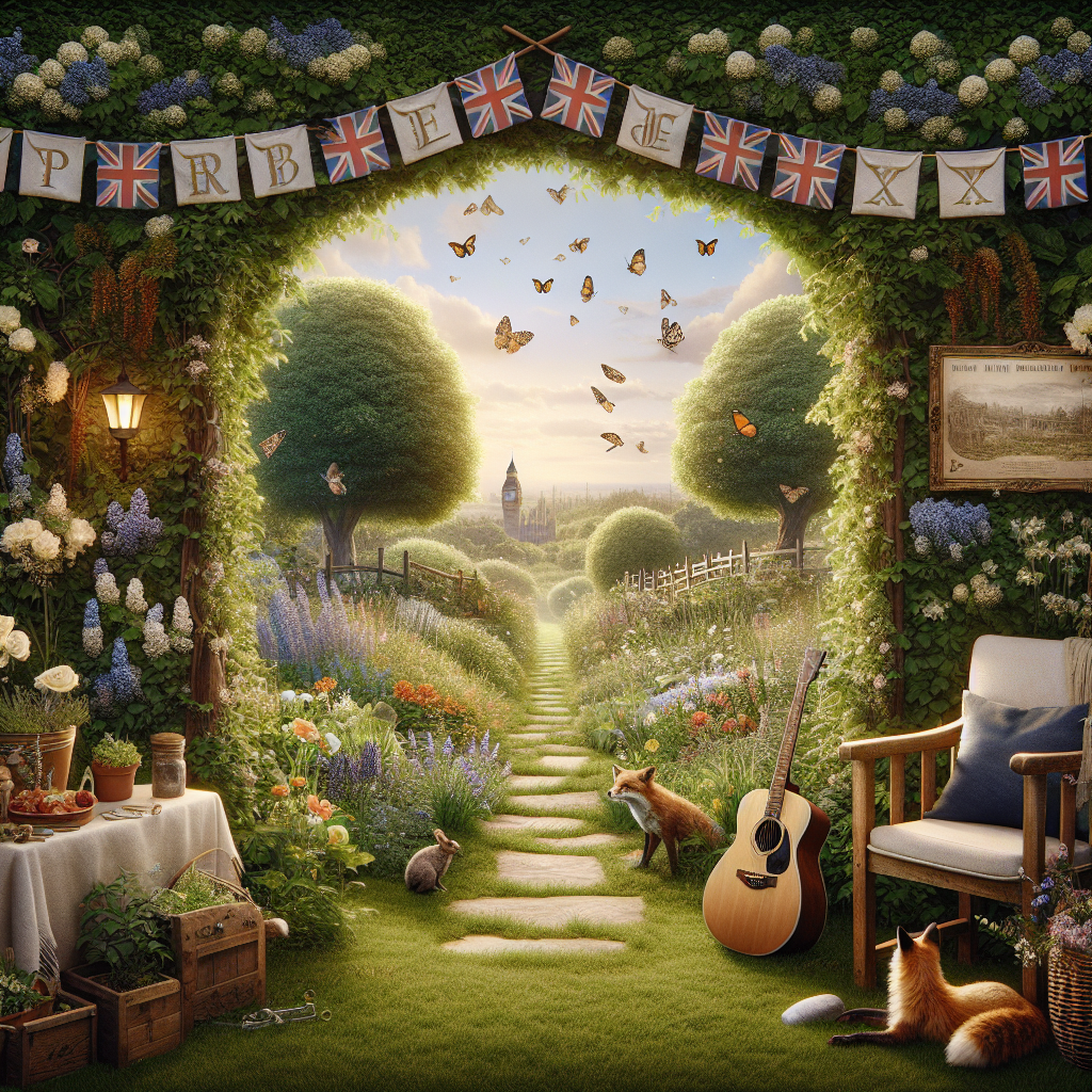 Create an engaging image that fuses the themes of RPG adventures and gardening, set amidst the enticing backdrop of British wildlife. The image should feature a lush garden in full bloom, which subtly transforms into an RPG wilderness filled with treasures. Decorative banners in white and navy colors, similar to those of a popular North London football club, are draped over hedge archways, amplifying the charm of this enchanted scenery. Tucked away in a comfortable corner, an acoustic guitar rests against a wooden bench, extending an open invitation for a musical serenade. The garden is under the vigilant care of a fox and a badger, with fluttering butterflies filling the air with a hint of magic.