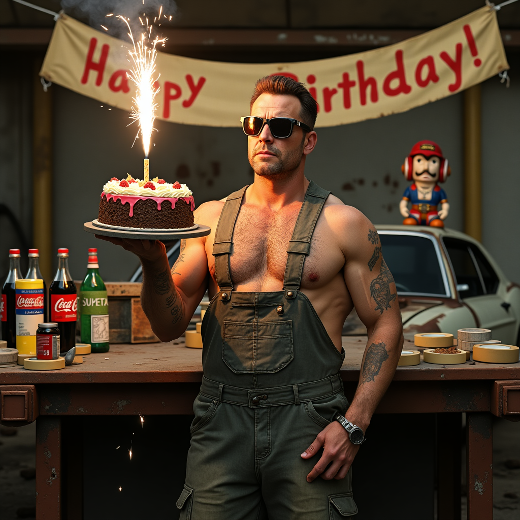 Create a realistic, humorous photograph-style image of a grizzled, Fallout-style post-apocalyptic welder who looks suspiciously like a GTA character mid-mission — rugged, sunglasses on, shirtless under a dirty vault jumpsuit, holding a birthday cake with sparklers ignited by a plasma torch. He stands in front of a rusty workbench littered with Nuka-Cola bottles, toolboxes, and duct tape, while a retro-futuristic “Happy Birthday” banner made of scrap metal and caution tape hangs crookedly above him. Behind him, an old abandoned muscle car has "Los Santos Welding Crew" spray-painted on the side, and a Vault Boy bobblehead peeks out from the hood. The atmosphere is both absurdly gritty and comically over-the-top — think GTA heist planning meets Mad Max party prep.