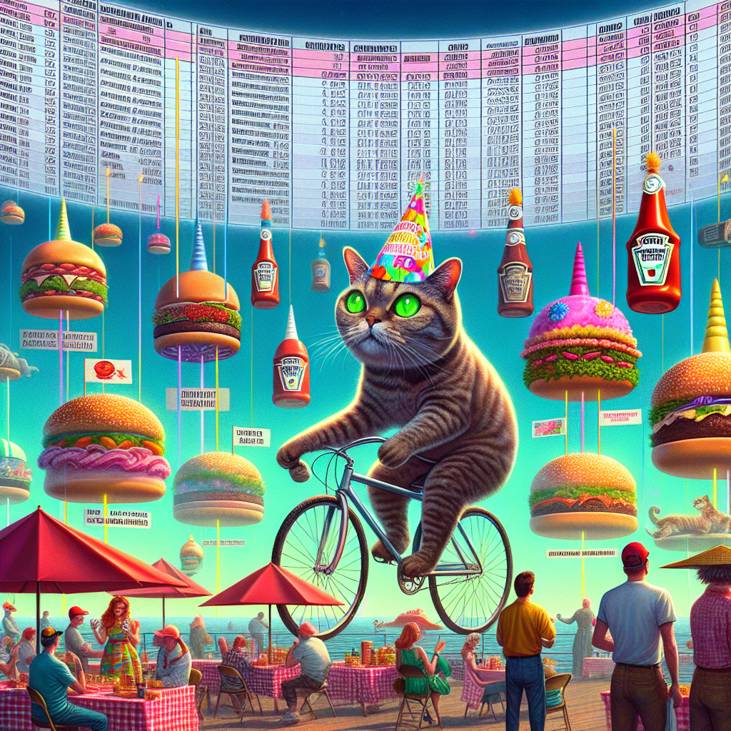 Visualize a peculiar birthday scenario in which the common meets the uncanny. Central to this festivity, an anthropomorphic cat of indeterminate descent confidently cycles, equipped with a safety helmet decorated with vivid birthday motifs. The ride is far from regular - the cat is the protagonist of a playful bike race against a backdrop of hovering colossal generic tomato ketchup bottles, symbolizing individual checkpoints. Onlookers, comprised of a diverse array of men, women, and non-binary guests, focus their gaze on an immense spreadsheet projected onto the transparent sky, tediously keeping tabs on race positions and circuit instances. Adjacent to this, a vendor booth proffers innovative burgers with a selection of fantastical toppings, each portion accompanied by a whimsical dollop of tomato sauce, gleaned directly from the levitating bottles overhead.