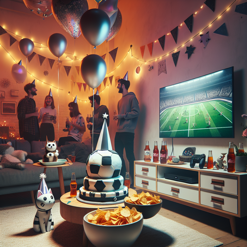 An intimate birthday celebration taking place in a warmly lit corner of a room. Decorations subtly hinting at a space theme, including festive banners and balloons with unconventional shapes, lend a unique charm to the setting. A modern gaming console can be seen beneath a TV, signaling a fun-filled invitation for attendees. There's amicable jesting over football while partygoers indulge in bowls heaped with assorted chips. In the midst of this, a monochrome cake styled like an owl catches the eye, nestled alongside frosty bottles of a popular sugar-free cola. Adorable felines wearing cartoonish party hats wander about, adding a playful touch to the euphoric atmosphere.